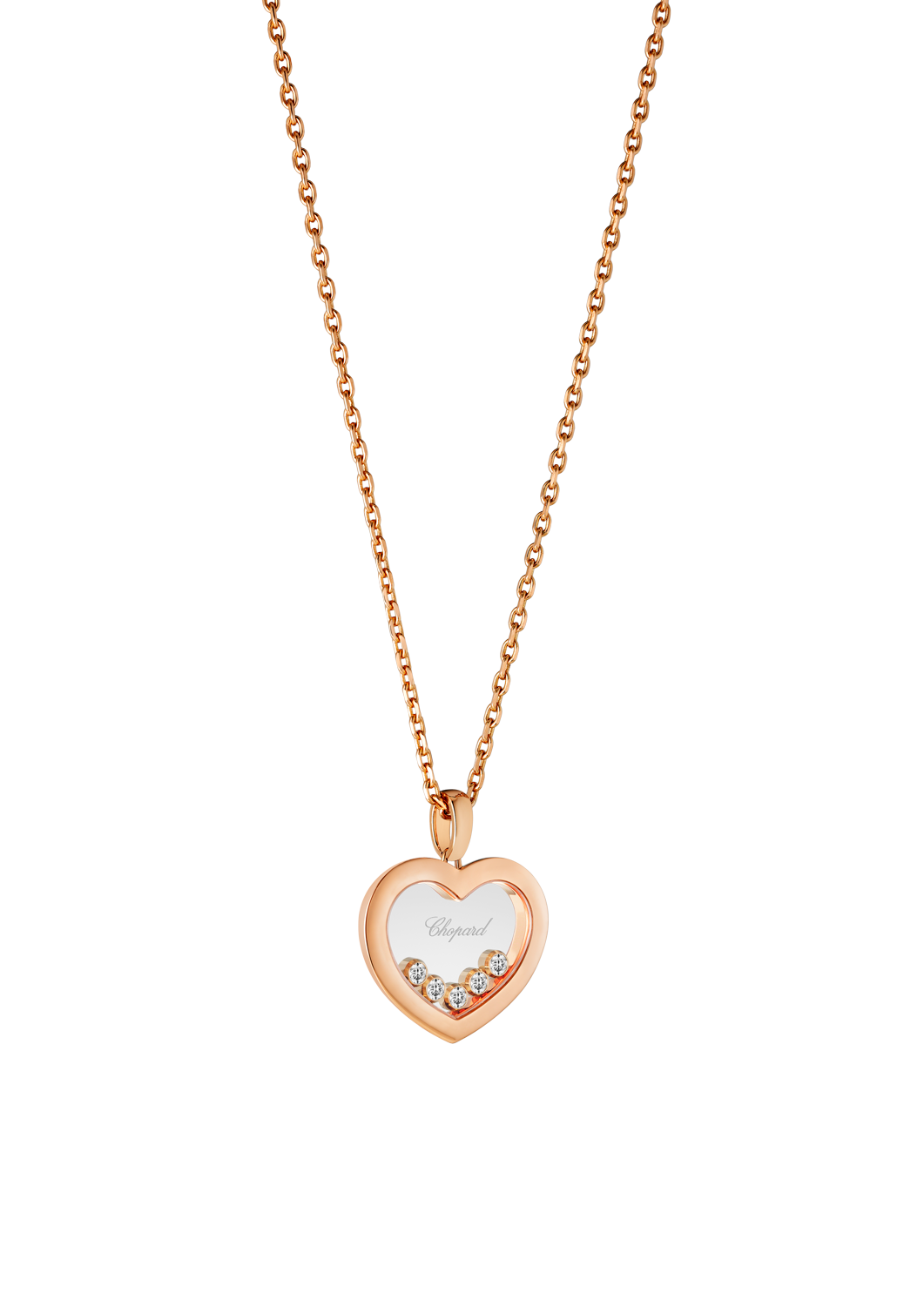 Als Herzstück der Damenschmuckserie ist die Kollektion Happy Diamonds Icons ebenso einzigartig wie verspielt. Inspiriert von den glitzernden Tropfen eines Wasserfalls wirbeln die fünf frei beweglichen Diamanten dieses neuen herzförmigen Anhängers aus 18 Karat Roségold (Referenznummer 79A038-5001) zwischen zwei Saphirgläsern umher und lassen eine zarte und fröhliche Kaskade des Lichts entstehen.