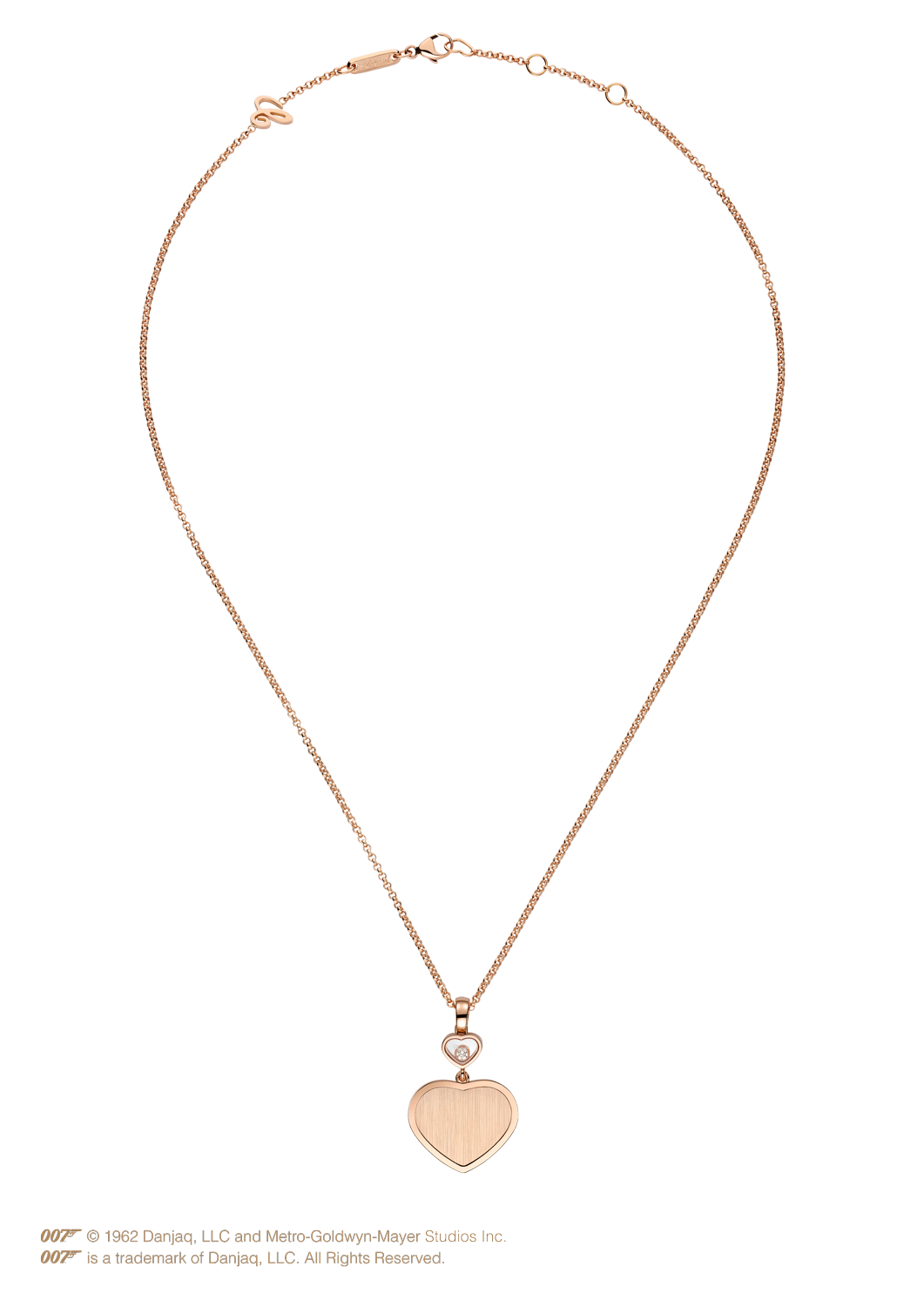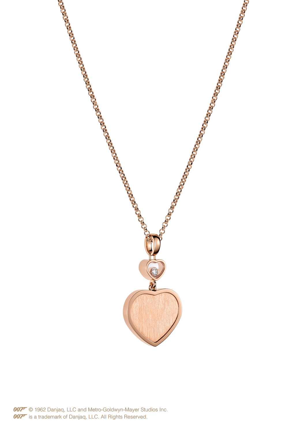 Die Co-Präsidentin und Kreativ-Direktorin Caroline Scheufele vermittelt ihre Vision der James-Bond-Frau: eine entschlossene und mutige Frau. Sie entschied sich für eine Neuinterpretation der „Happy Hearts“-Kollektion mit Herzen, die mit ethischem Roségold ausgefüllt sind. Gold ist ein Leitmotiv, auf das in den James-Bond-Filmen häufig Bezug genommen wird. Der Anhänger Chopard Happy Hearts Golden Hearts 79A007-5021 ist Teil einer Limited-Edition-Kollektion aus 7007 Teilen.