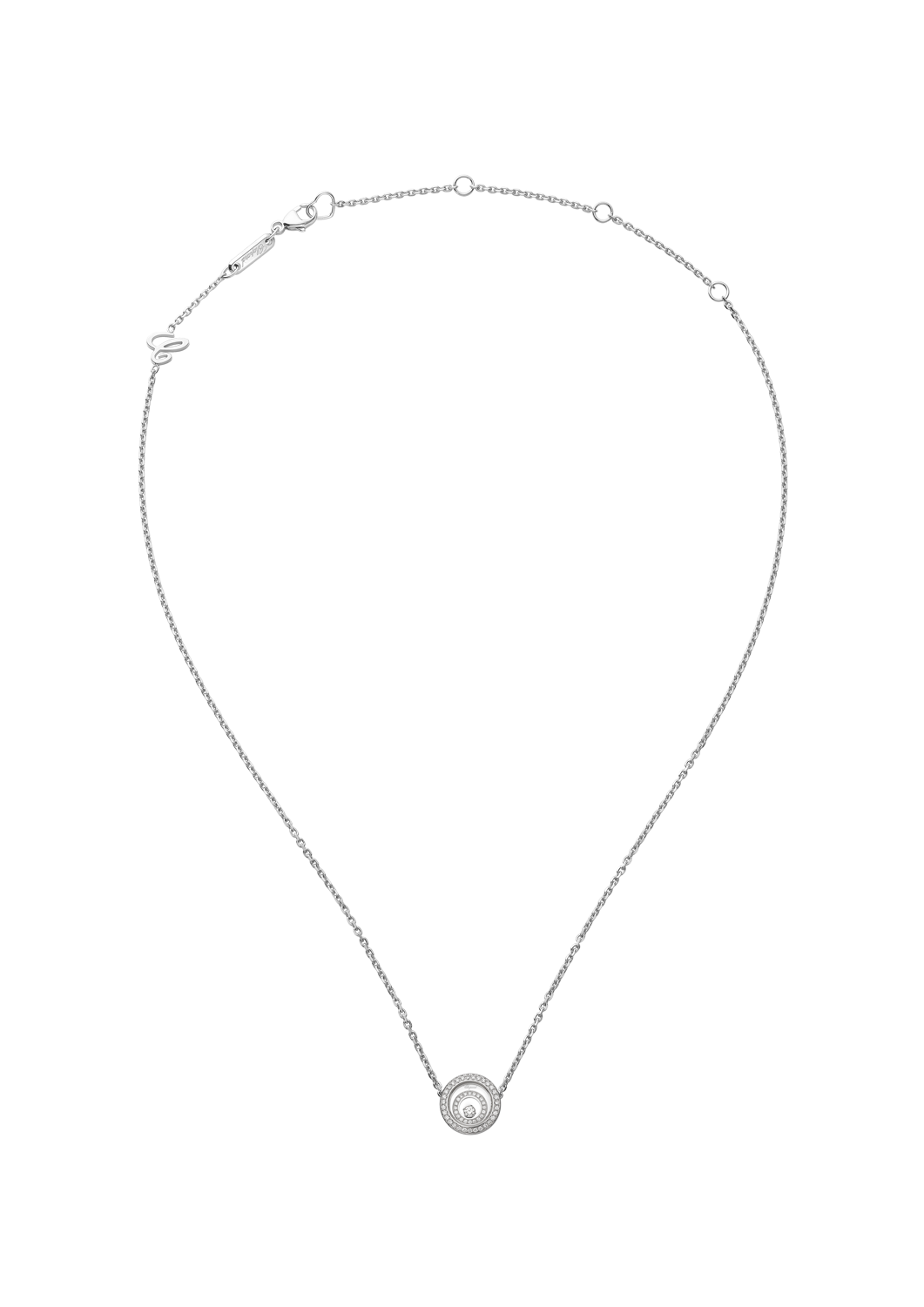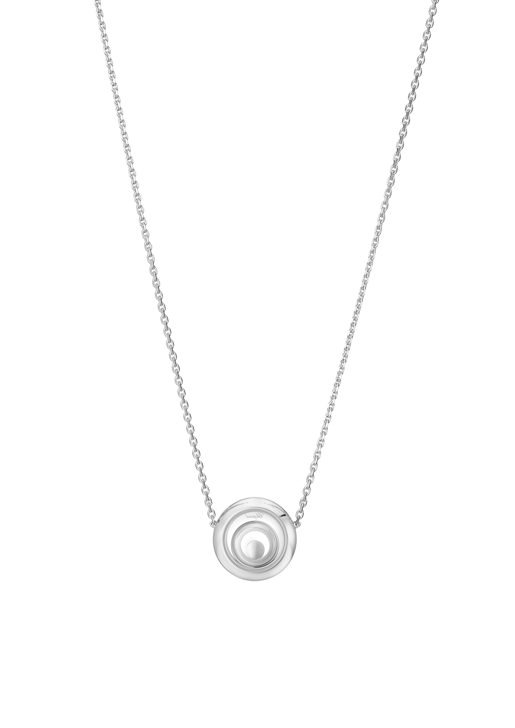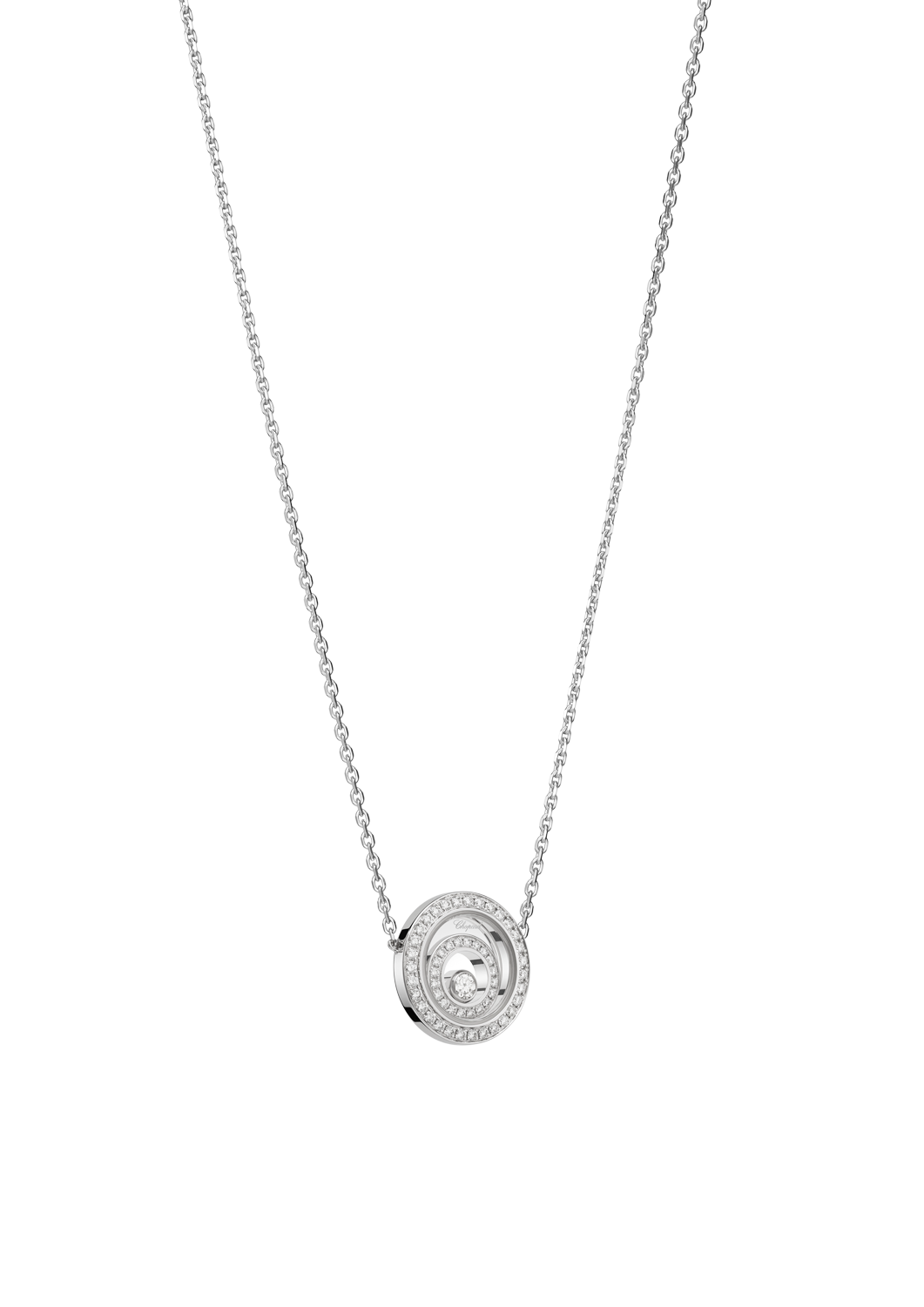 Wenn elegantes Design und höchster Luxus zusammenkommen: Konzentrische kleine Wellen aus Diamanten umkreisen hypnotisch den beweglichen Diamanten im Zentrum dieses mit Diamanten besetzten Anhängers Happy Spirit 818230-1001 in 18 Karat Weissgold. Zum Tanz des frei beweglichen Diamanten gesellt sich ein bezauberndes Spiel aus Fülle und Leere.