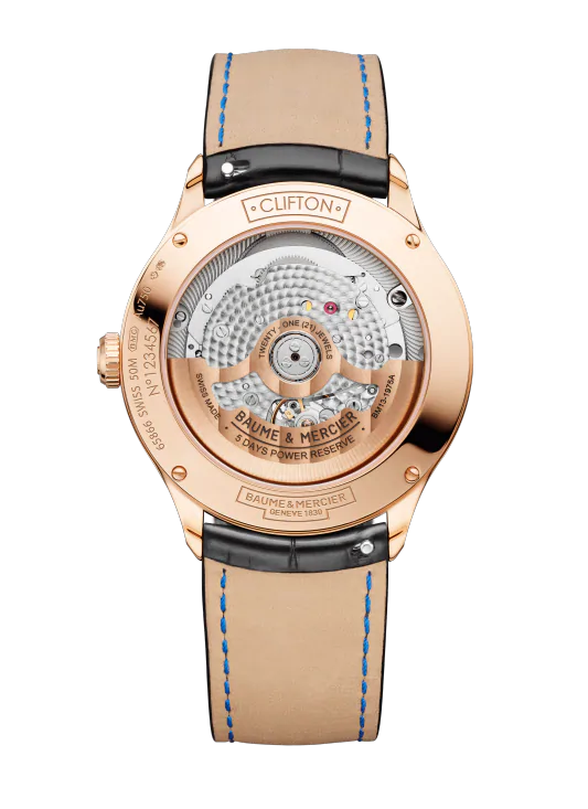 Der Herrenchronometer Clifton Baumatic 10469 mit warmweißem Zifferblatt und poliertem Gehäuse aus 18 Karat Rotgold steht für moderne Raffinesse. Diese Herrenuhr verfügt über ein schwarzes Alligatorlederarmband mit grauen Nähten.