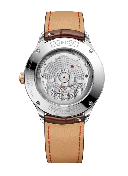 Diese 40-mm-Uhr Clifton Baumatic 10519 mit Datum aus Schweizer Herstellung verbindet höchste Präzision und Traditionsbewusstsein. Sie ist ein eleganter Zeitmesser für Herren und besitzt ein mechanisches hauseigenes Uhrwerk mit Automatikaufzug. Sie verfügt über ein braunes Alligatorlederarmband und ein weißes Zifferblatt mit Datumsfunktion bei 3 Uhr sowie über vergoldete Zeiger und Indexe. Das zweifarbige Uhrengehäuse aus Edelstahl und Gold ist mit einem durchsichtigen Saphirglasboden ausgestattet, unter dem das Automatikwerk der Uhr zu sehen ist.