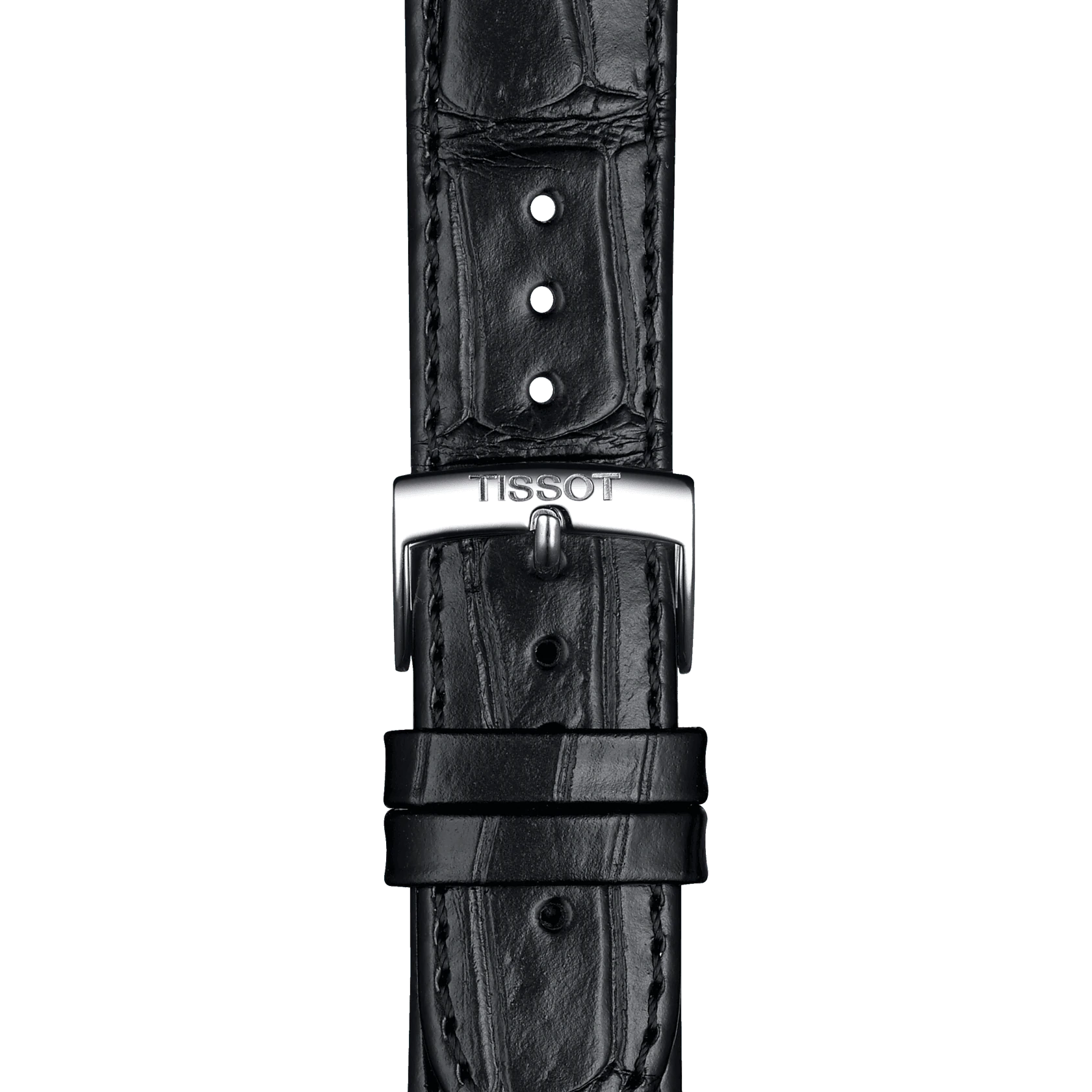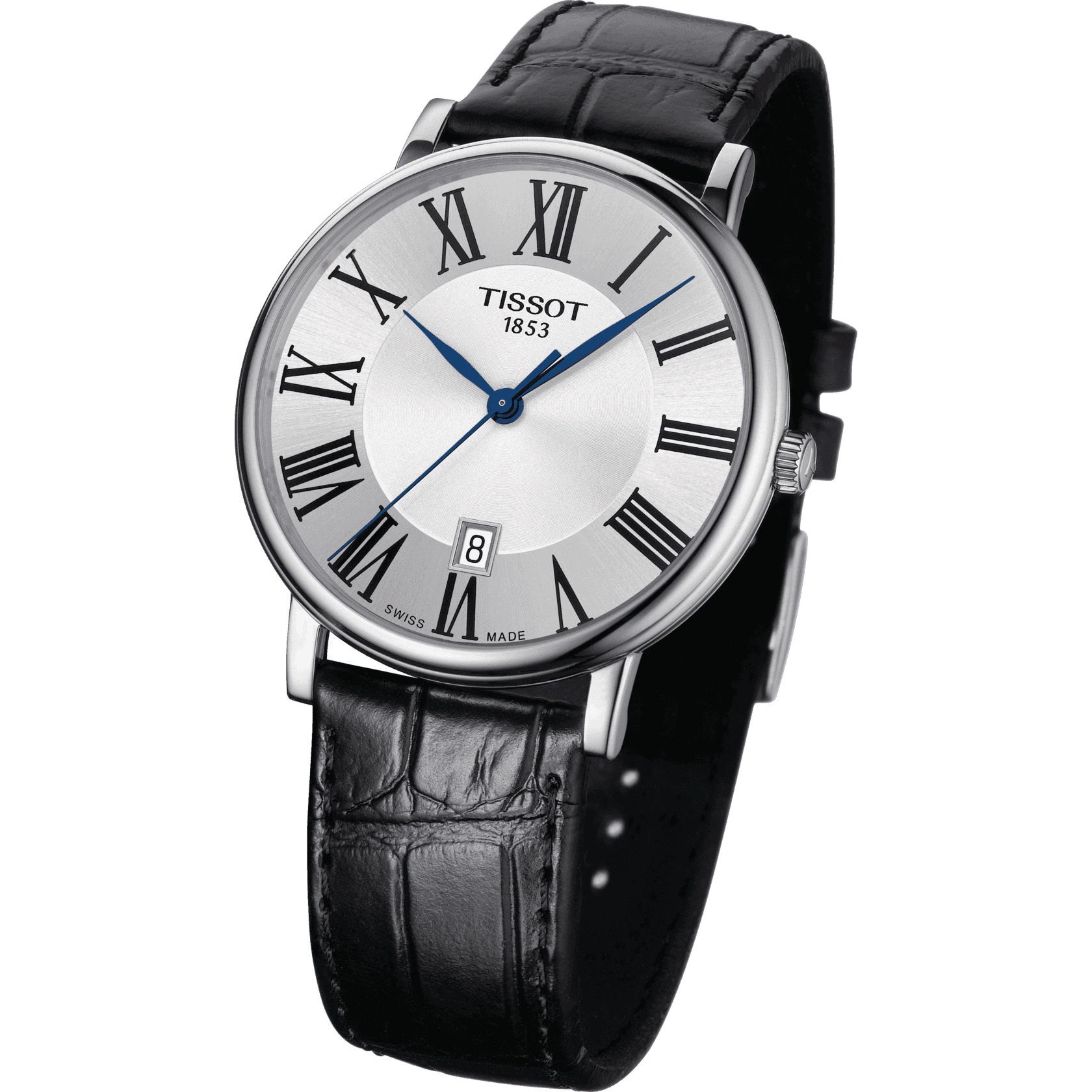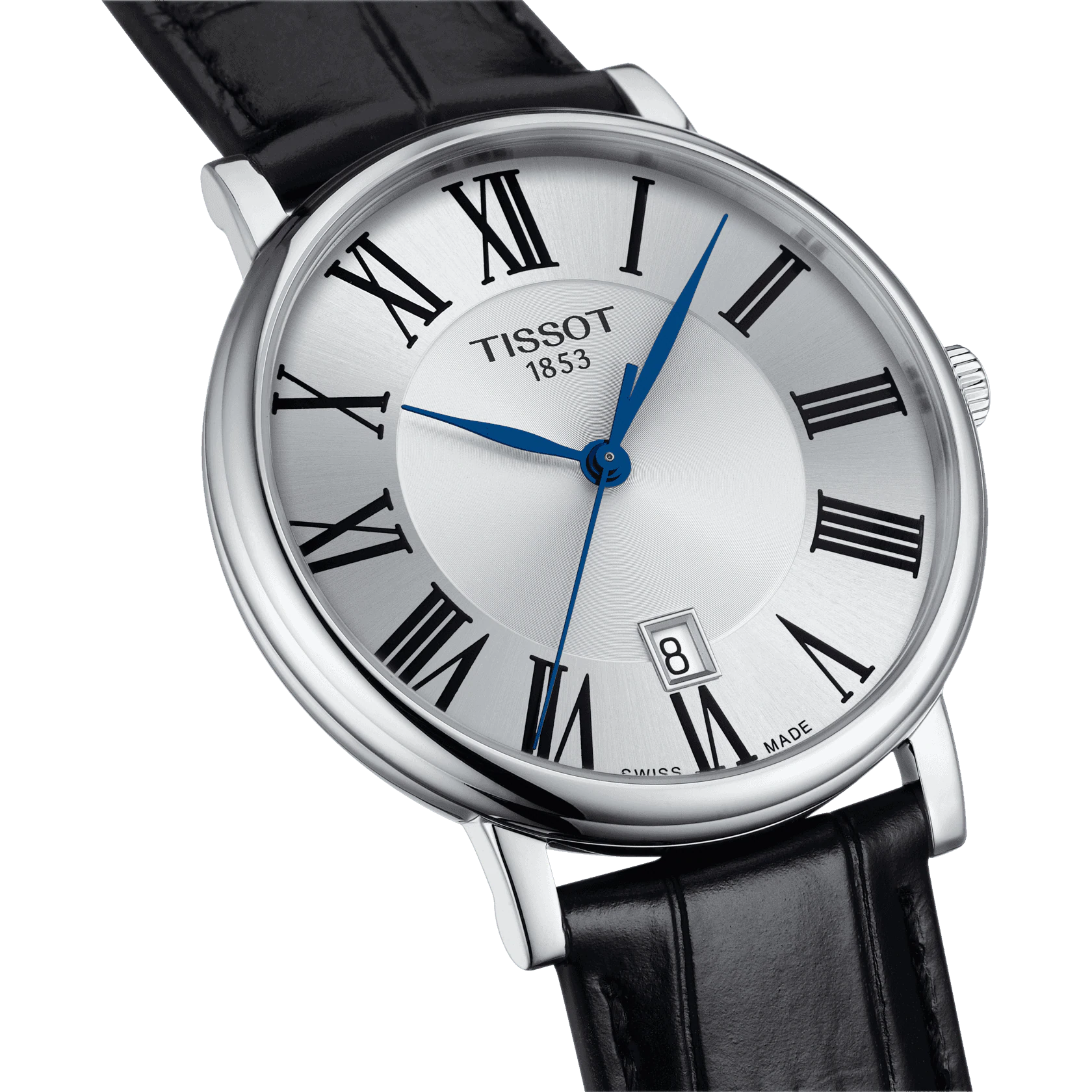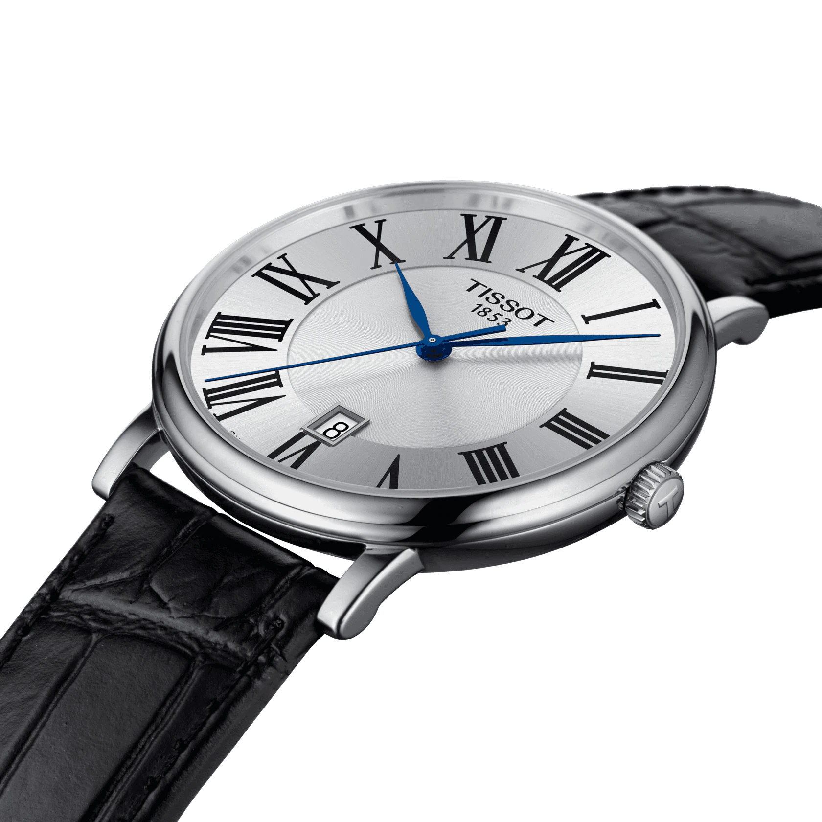 Durch ihr puristisches Design, ihre Stilsicherheit und die schmeichelhaften Veredelungen wird die Tissot Carson Premium -Kollektion immer perfekt sein. Als „Innovator by Tradition“ fügt Tissot dem die Anerkennung und Kraft seines Namens hinzu, der international für die Qualität seiner Swiss Made Produkte gerühmt wird. Die Tissot Carson Gent präsentiert sich in unterschiedlichen Ausführungen mit Leder- oder 316L - Edelstahlarmband sowie mit PVD-Beschichtungen oder ganz klassisch in Edelstahl. Die Anwendung der PVD-Beschichtungstechnik bietet alle Vorteile von goldfarbenen Farbvarianten – seine Beständigkeit, seine Wärme, seinen edlen Glanz –, ohne dass dies den Preis beeinflusst. Diese Uhr mit einem ausgewogenen Durchmesser von 40 mm ist mit einem Swiss Made Quartzuhrwerk ausgerüstet. Diese Ausführung hat ein 316L-Edelstahlgehäuse und ein kratzfestes Saphirglas sowie ein silberfarbenes Zifferblatt mit Datumsanzeige und römischen Ziffern. Die blauen Zeiger runden das edle Aussehen zusätzlich ab. Das schwarze Lederarmband besitzt eine Standardschließe.