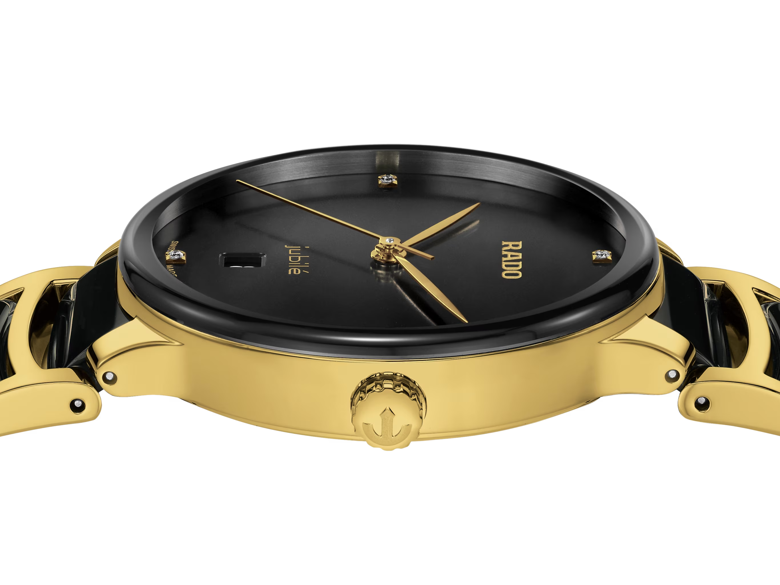 Die klassische Centrix Quartz Diamonds wurde nicht nur technisch, sondern auch ästhetisch überarbeitet. Beim neuen Modell reicht das gewölbte Saphirglas bis hin zum Rand und scheint nahtlos in das sanft gerundete Gehäuse überzugehen. Die Gesamtoptik dieses ikonischen Zeitmessers wird durch überarbeitete Bandanstösse am Gehäuse und ein Armband aus poliertem gelbgoldfarbenem Edelstahl mit PVD-Beschichtung und Mittelgliedern aus schwarzer Hightech-Keramik abgerundet. Das schwarz lackierte Zifferblatt mit 4 Diamanten kommt durch das aufgedruckte Jubilé-Logo noch besser zur Geltung und ist perfekt auf die gelbgoldfarbenen Zeiger abgestimmt. Dank der PreciDrive- und HeavyDrive-Technologie im R073 Quarzwerk zeichnet sich die Uhr durch eine grössere Genauigkeit und Stossfestigkeit aus. Die Uhr ist bis zu einer Tiefe von 50 m wasserdicht.
