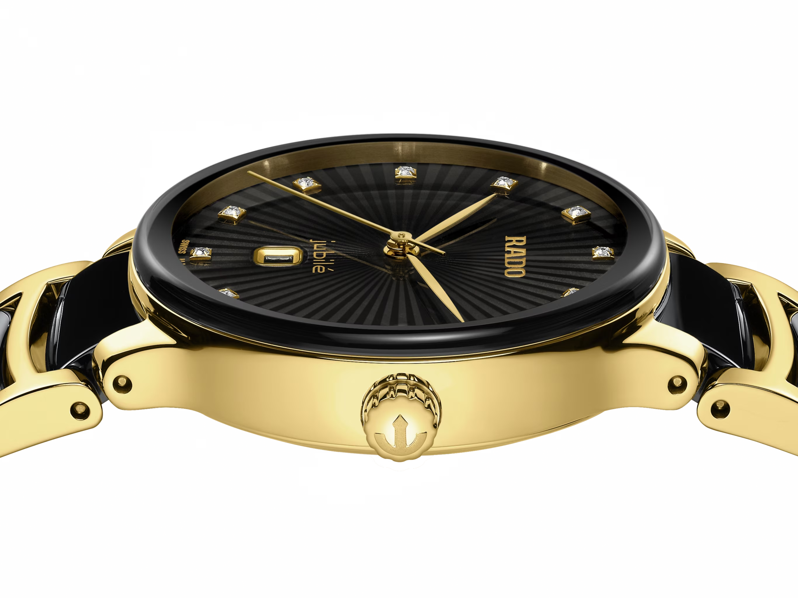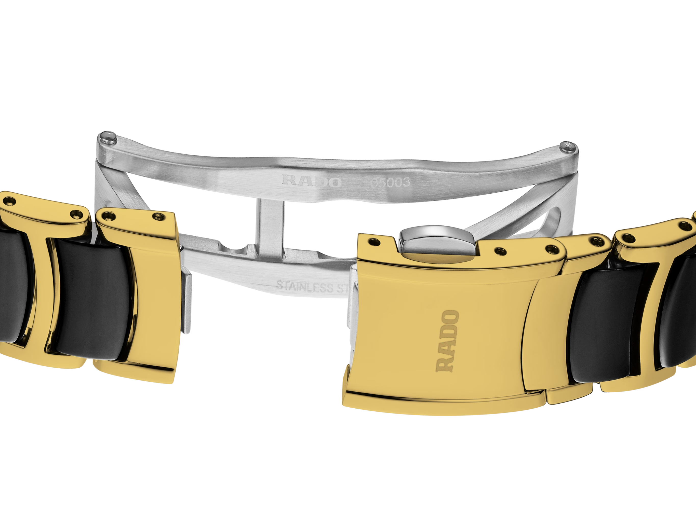 In einem patentierten Verfahren, das von Rado als erstem Hersteller eingesetzt wurde, wird Hightech-Keramik bei extrem hohen Temperaturen in einem Ofen erhitzt. Bei 20.000 °C aktivierte Gase wandeln die fertige weiße Keramik in ein einzigartiges Material mit nahezu außerirdischem Metallic-Glanz um, der ganz ohne den Einsatz von Metall erreicht wird. In einem Prozess, der modernen Alchemiekünsten gleichkommt, wird die Farbe der Keramik verändert, ohne dabei ihre zugrunde liegenden Eigenschaften – leichtes Gewicht, Härte und Tragekomfort – zu beeinträchtigen.