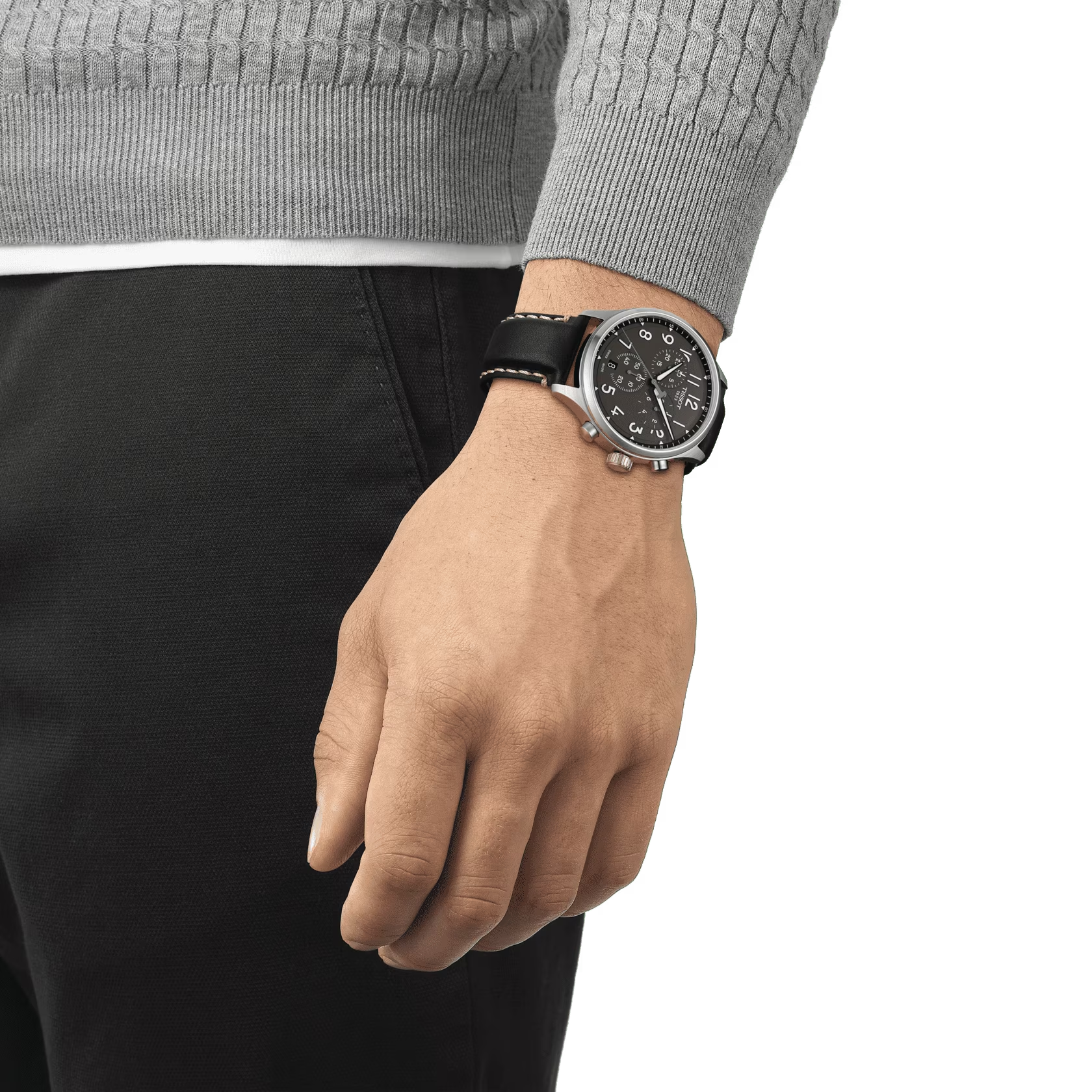 Dieses Tissot Chrono XL Vintage Modell  T116.617.16.062.00 verfügt über ein anthrazitfarbenes Zifferblatt sowie ein schwarzes Lederarmband mit Schnellwechselsystem, hellen Kontrastnähten und einer Dornschließe.