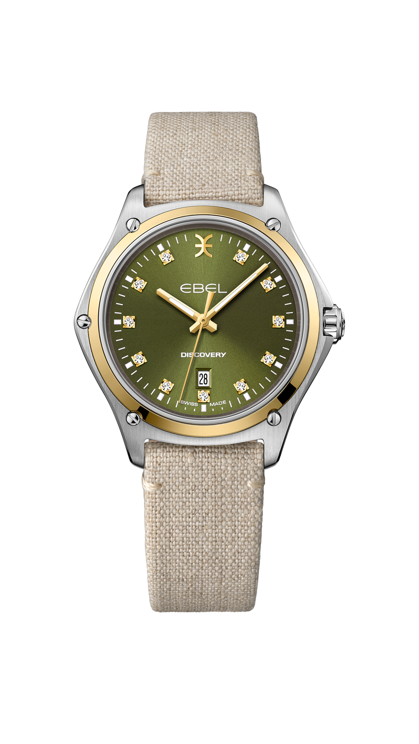EBEL Discovery Lady 1216548: Gehäuse aus Edelstahl und 18K Gelbgold, Ø 33 mm, grünes Zifferblatt mit 11 Diamanten (0.0715 ct.), innenseitig entspiegeltes Saphirglas, Armband aus Edelstahl mit 3N vergoldeten Gliedern und zusätzliches Stoffband, Schweizer Quarzwerk, wasserdicht bis 10 bar