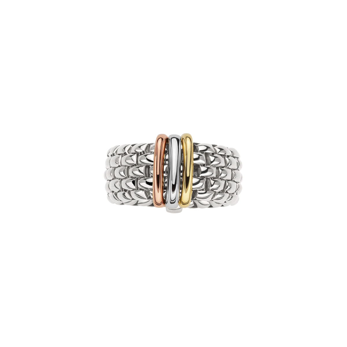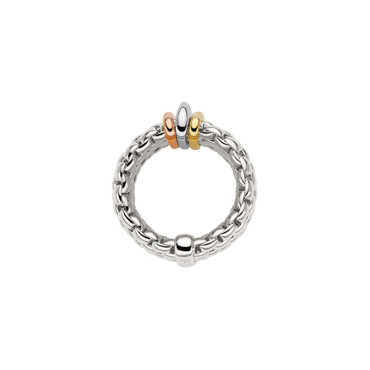 Ein flexibler Ring aus 750er Weißgold in Kombination mit drei Ronden in Rosé-, Gelb- und Weißgold. Seitdem Fope 2007 das Konzept der flexiblen Goldarmbänder ins Leben gerufen hat erfreut es sich international eines enormen Erfolgs. Bei Fope Flex It handelt es sich um eine revolutionäre Art und Weise des Tragens von Schmuck: Bislang hat es kein anderer Hersteller geschafft, flexible Armbänder aus Gold zu produzieren, ohne dabei andere Materialien als Gold zu verwenden.