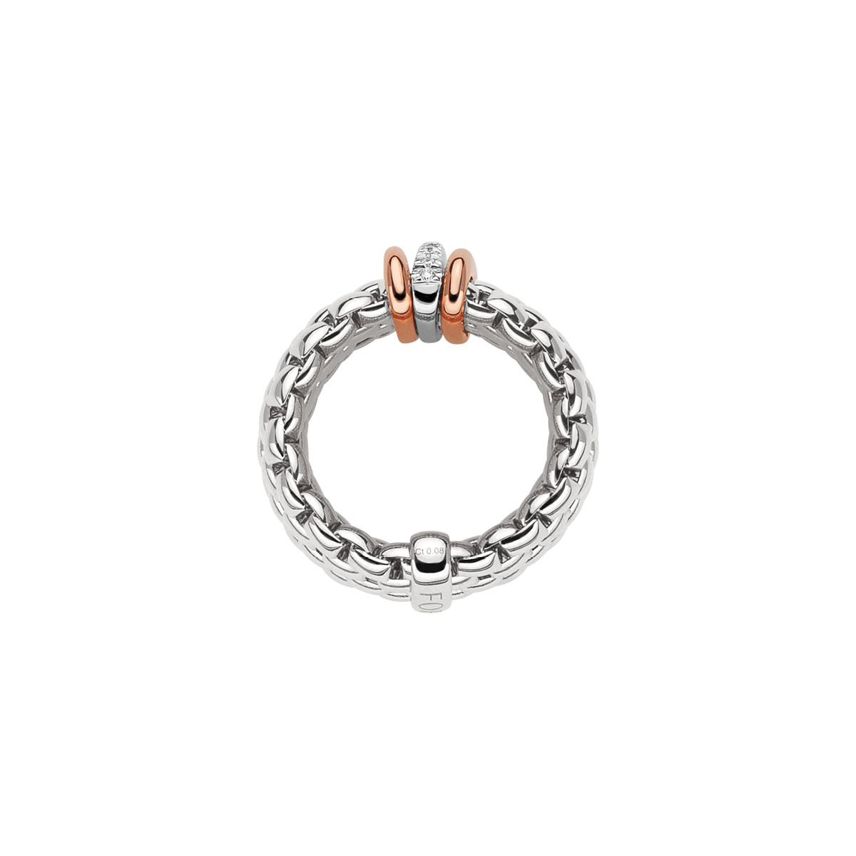 Ein flexibler Ring aus 750er Weißgold in Kombination mit zwei roségoldenen und einer 750er Weißgold-Ronde in der 0,08 Karat Diamanten im  Brillant Schliff gefasst sind. Seitdem Fope 2007 das Konzept der flexiblen Goldarmbänder ins Leben gerufen hat erfreut es sich international eines enormen Erfolgs. Bei Fope Flex It handelt es sich um eine revolutionäre Art und Weise des Tragens von Schmuck: Bislang hat es kein anderer Hersteller geschafft, flexible Armbänder aus Gold zu produzieren, ohne dabei andere Materialien als Gold zu verwenden.