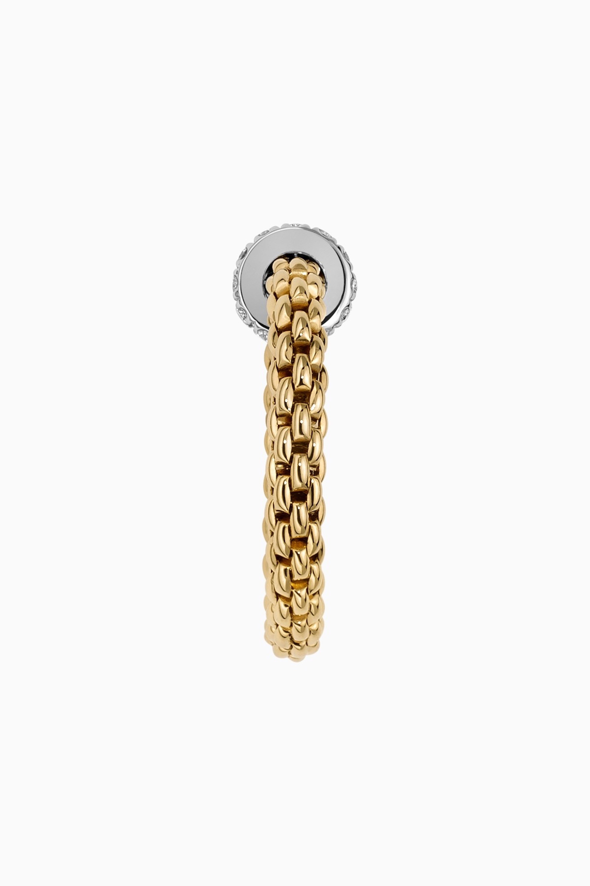 Ein flexibler Ring vollstaendig aus 750 Gelbgold mit Rondellen aus Gold- und Diamantpavé. Die Staerke betraegt 3,4 mm. Seitdem Fope 2007 das Konzept der flexiblen Goldarmbänder ins Leben gerufen hat erfreut es sich international eines enormen Erfolgs. Bei Fope Flex It handelt es sich um eine revolutionäre Art und Weise des Tragens von Schmuck: Bislang hat es kein anderer Hersteller geschafft, flexible Armbänder aus Gold zu produzieren, ohne dabei andere Materialien als Gold zu verwenden.