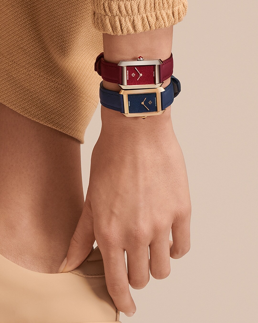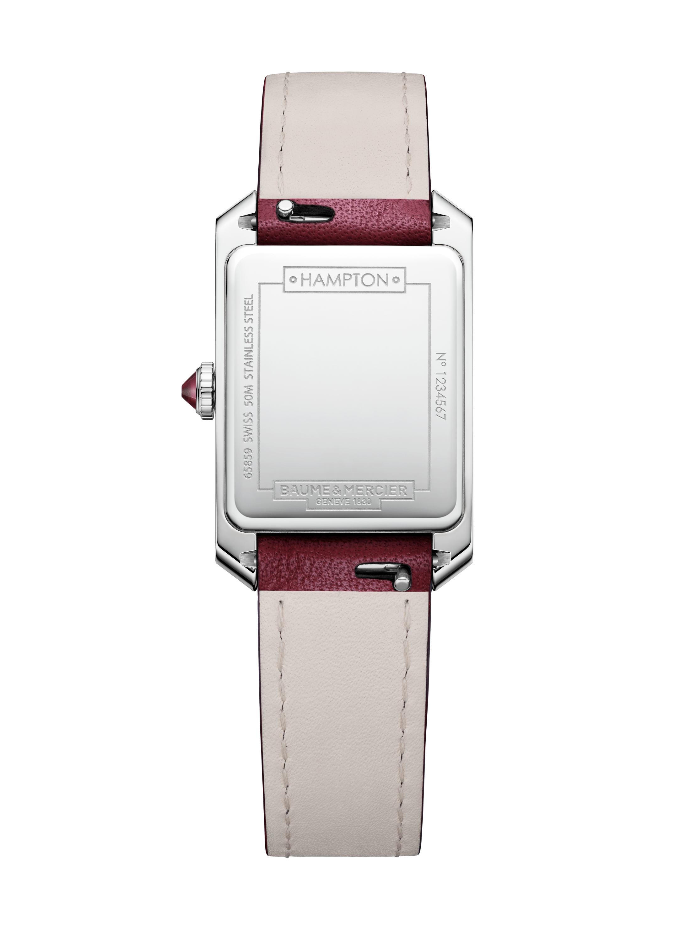 Die Hampton 10673 spielt mit einer harmonischen Kombination aus Farbe und Material. Dieser rechteckige Zeitmesser aus poliertem Edelstahl verfügt über ein burgunderrotes Zifferblatt und ein glitzerndes burgunderrotes Kalbslederarmband für einen monochromen und eleganten Touch.