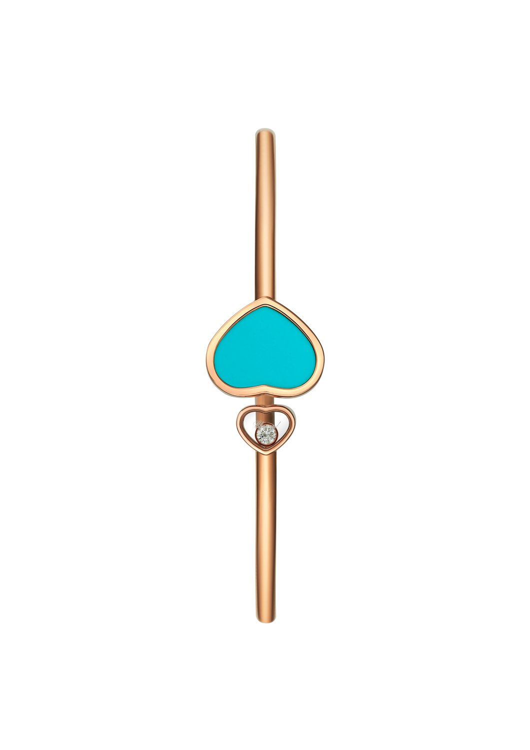 Die „Happy Hearts“-Reihe stellt das Herz als symbolisches Motiv der „Happy Diamonds“-Kollektion in den Mittelpunkt und interpretiert es mit unbeschwerter Kreativität. Das zeitlose Armband aus 18 Karat Roségold strahlt an beiden Enden mit zwei eleganten Herzen: ein grosses Herz aus türkisem Stein am einen und ein kleineres Herz am anderen Ende, in dem einer der berühmten, frei beweglichen Diamanten von Chopard sich einem funkelnden Tanz der Liebe hingibt.
