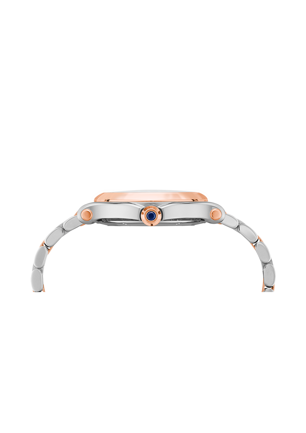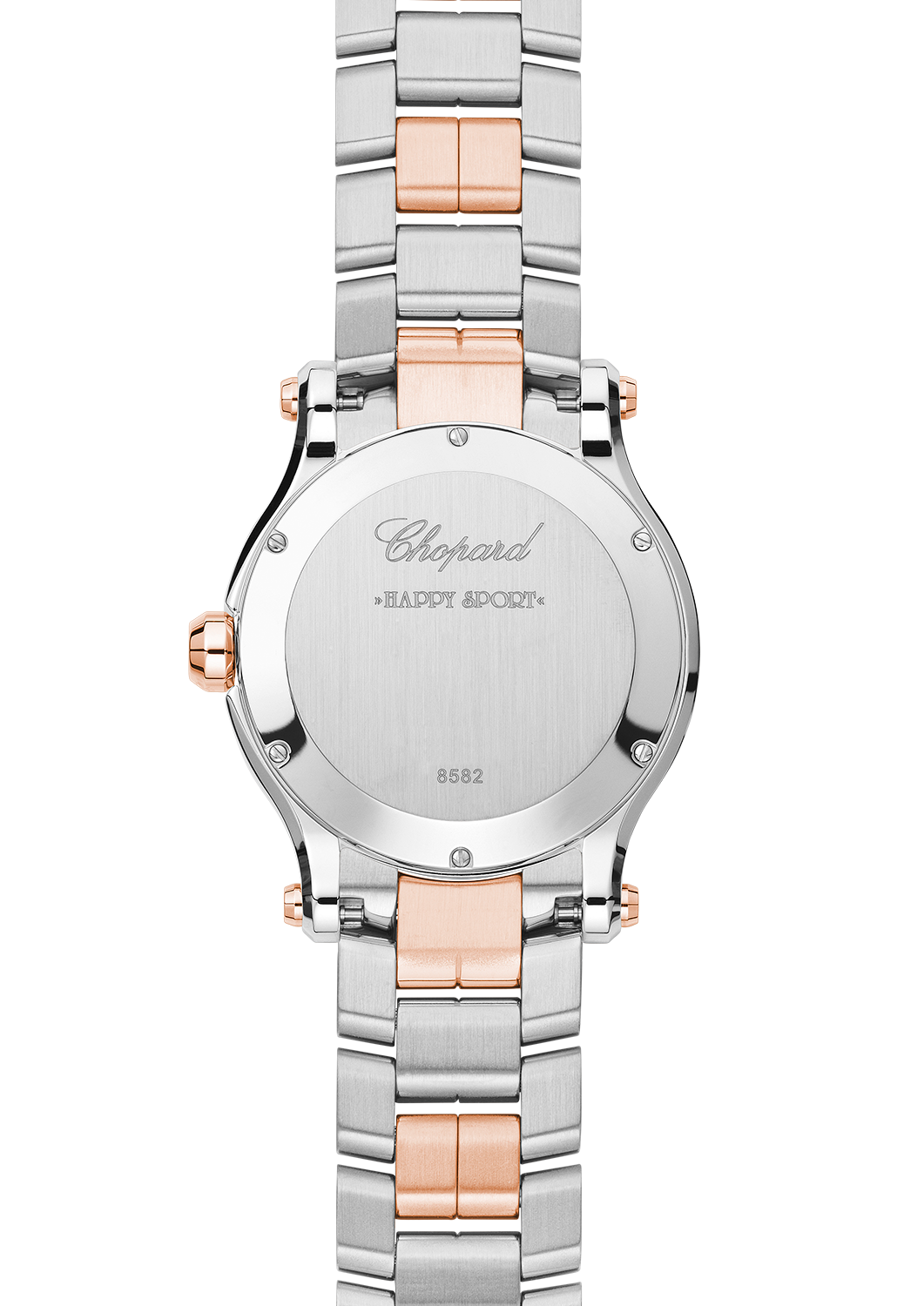 Die Uhr Happy Sport 36 mm Quarz aus Edelstahl und 18 Karat Roségold (Referenznummer 278582-6002) versprüht schillernde Weiblichkeit. Die markante Form der polierten Lünette und die eleganten Bandansätze, an denen die weichen Kurven sich fortsetzen, bilden einen Kontrast zu den fünf unbeschwert herumwirbelnden Diamanten. Gleichzeitig verleiht das passende, zweifarbige Metallband dem Design einen erlesenen Touch, der in perfekter Harmonie zu der Vision steht, die Chopard von der Frau von heute und ihrer unbändigen Lebensfreude hat.