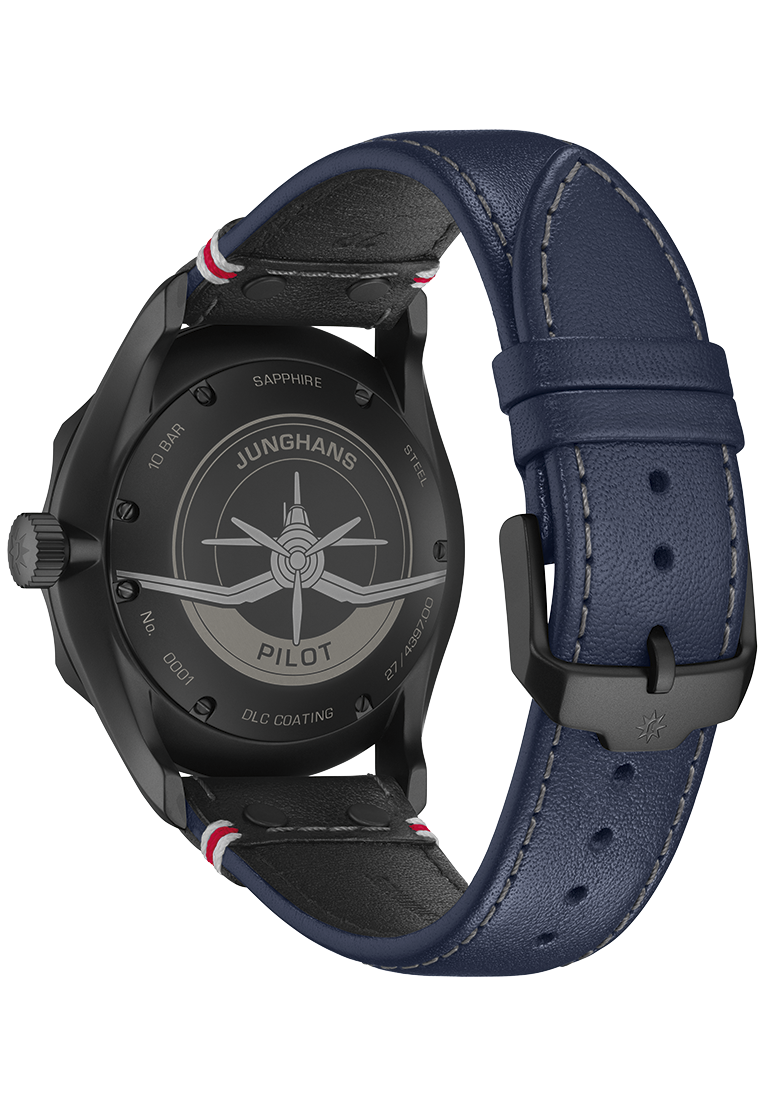 Lebenswichtig für Piloten, erfreulich für Uhrenliebhaber: die gute Ablesbarkeit der Pilot Automatic. Authentischen Bordinstrumenten nachempfunden, verstärken die großen Zahlen der Datumsanzeige den Cockpit-Charakter der Uhr. Die Kleine Sekunde mit rotem Zeiger sorgt für zusätzliche Übersichtlichkeit. Das historische Logo auf dem Zifferblatt weist auf die traditionelle Verbundenheit von Junghans zur Luftfahrt hin.