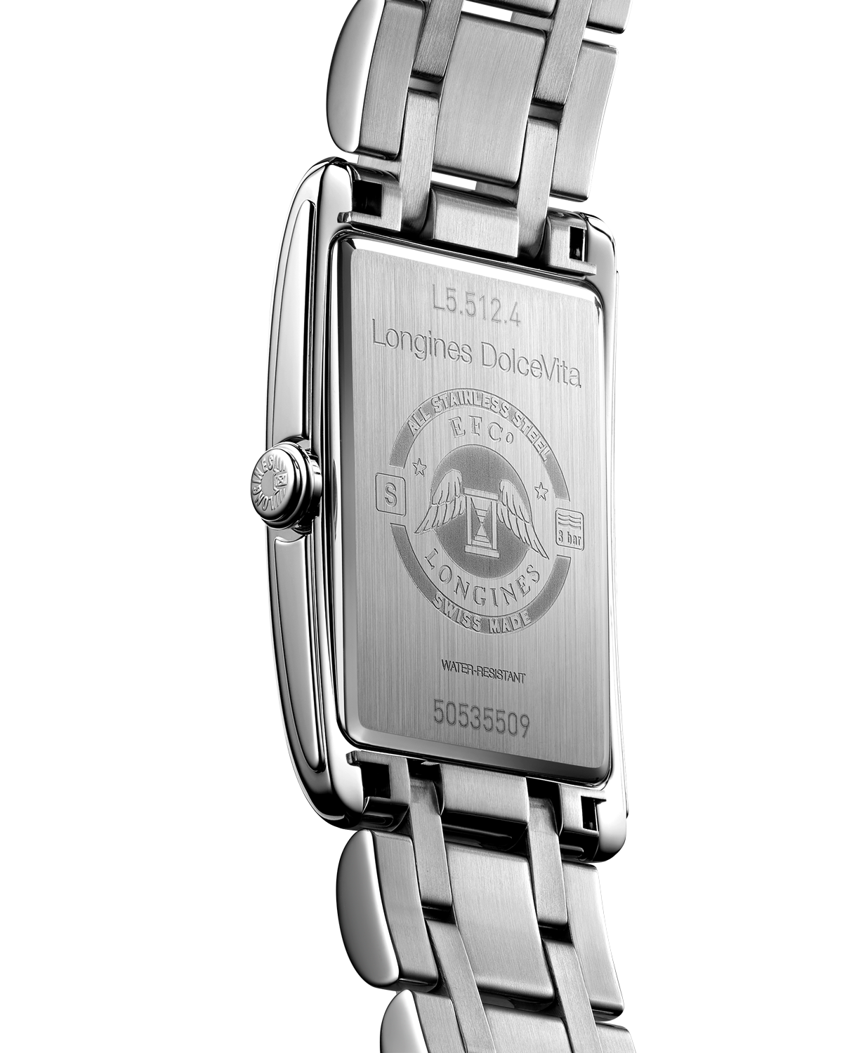 Seit ihrer Entstehung wird die Kollektion Longines DolceVita als eine Hymne an das süße Leben verstanden. Heute wird für diese Kollektion ein neues Kapitel aufgeschlagen und eine Neuinterpretation mit weicher Linienführung präsentiert. Das aus Edelstahl gefertigte und mit Diamanten verzierte 23 x 37 mm Modell ist mit einem weißen Zifferblatt mit aufgemalten römischen Ziffern versehen. Die Stunden und Minuten werden mit Zeigern aus gebläutem Edelstahl ausgewiesen. Der mit einem Quarzwerk ausgestattete Zeitmesser ist mit einem Armband aus Edelstahl erhältlich.
