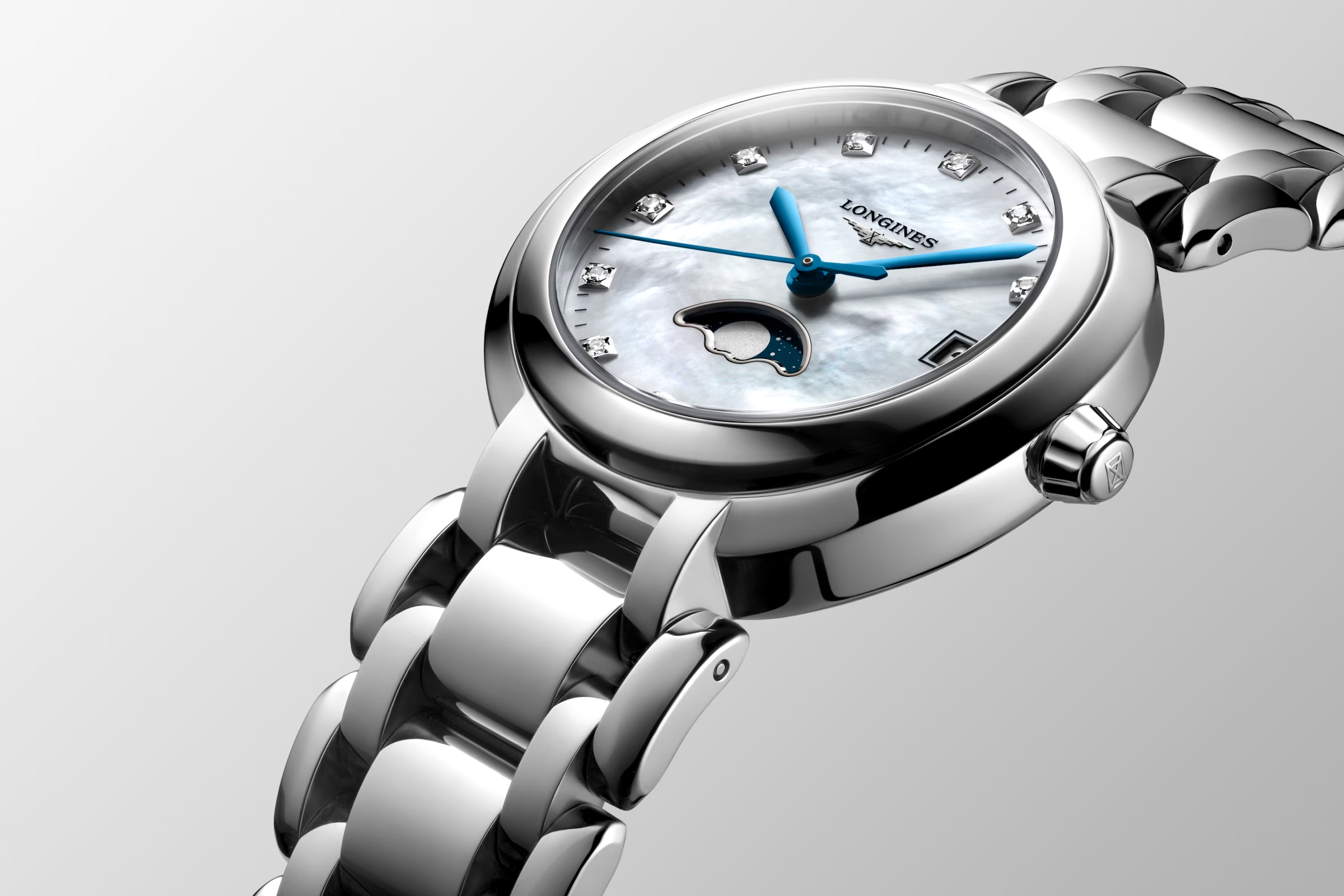 Auch wenn die Marke Longines bekannt dafür ist, ihre Modelle an Frauen wie Männer gleichermassen zu richten, präsentiert sich die Kollektion Longines PrimaLuna seit 2009 exklusiv weiblich. Ihr charakteristisches Gehäuse ist, wie ihr Name verrät, vom Mond und seiner Poesie inspiriert. Ein Perlmutt-Zifferblatt mit Diamanten weckt Erinnerungen an den schimmernden Nachthimmel. Die Longines PrimaLuna L8.115.4.87.6 wird von einem Quarzwerk angetrieben und verfügt über ein Datumsfenster.