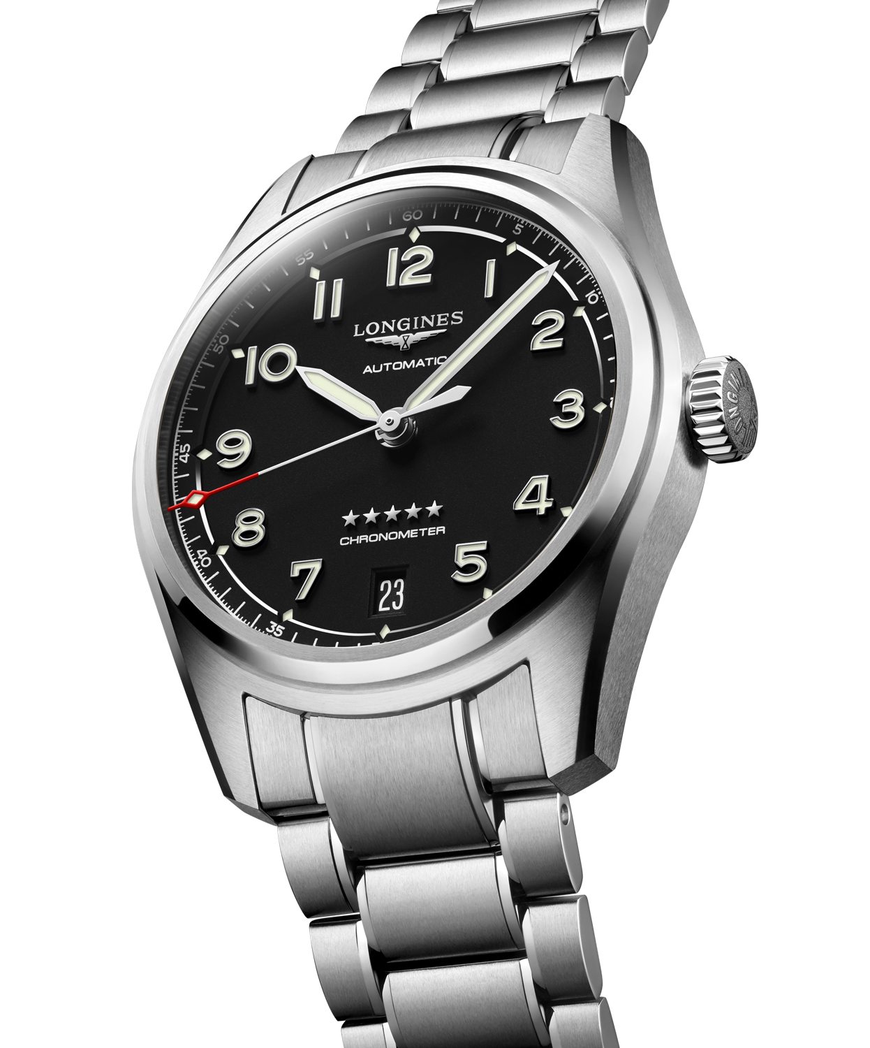 heute. Ihr satiniertes und poliertes Edelstahlgehäuse mit 37 mm Durchmesser birgt ein exklusives, COSC-zertifiziertes Automatikuhrwerk (L888.4) mit Siliziumspirale. Ein gewölbtes Saphirglas schützt ein mattschwarzes Zifferblatt mit arabischen Ziffern und rhodinierten und sandgestrahlten Zeigern mit Super-LumiNova-Beschichtung.