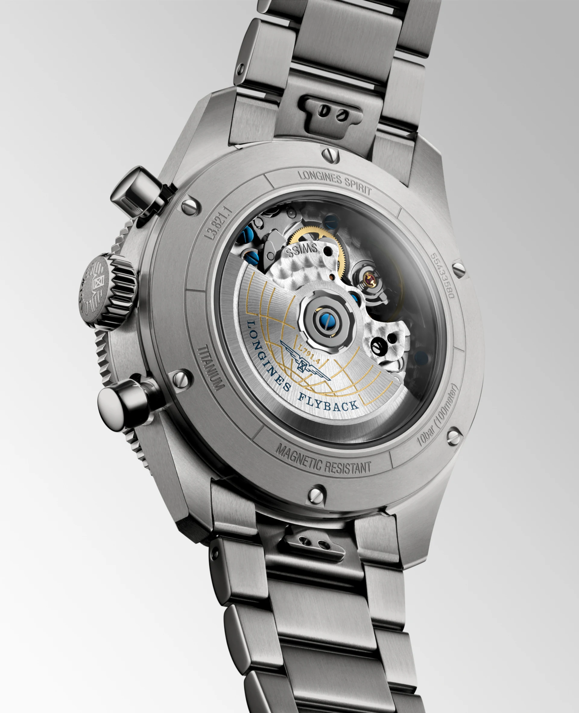 Mit der LONGINES SPIRIT FLYBACK, die in diesem Jahr ihre Premiere feierte, wurde ein neues Kapitel in der langen Geschichte der LONGINES Fliegeruhren aufgeschlagen. Die Linie wird nun um eine Titanversion erweitert, die ebenfalls von der COSC (Contrôle Officiel Suisse des Chronomètres») zertifiziert ist und geringes Gewicht, markantes Design sowie höchste Präzision miteinander vereint. Die grosse Präzision der Longines Spirit Flyback wird durch das exklusive Longines Kaliber L791.4 gewährleistet, das gegen Magnetfelder resistent und mit einer Spiralfeder aus Silizium ausgestattet ist. Das Uhrwerk verfügt über eine Gangreserve von