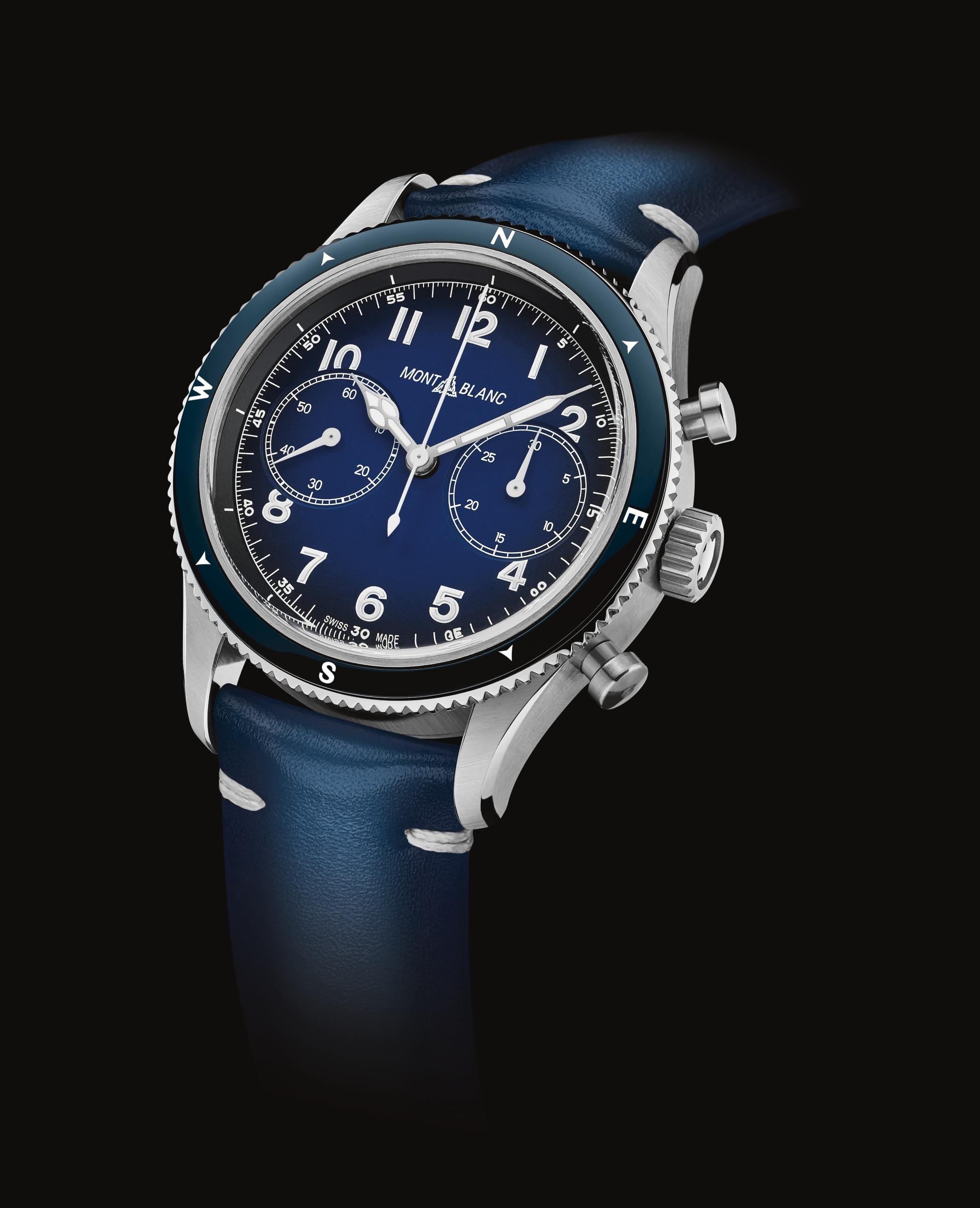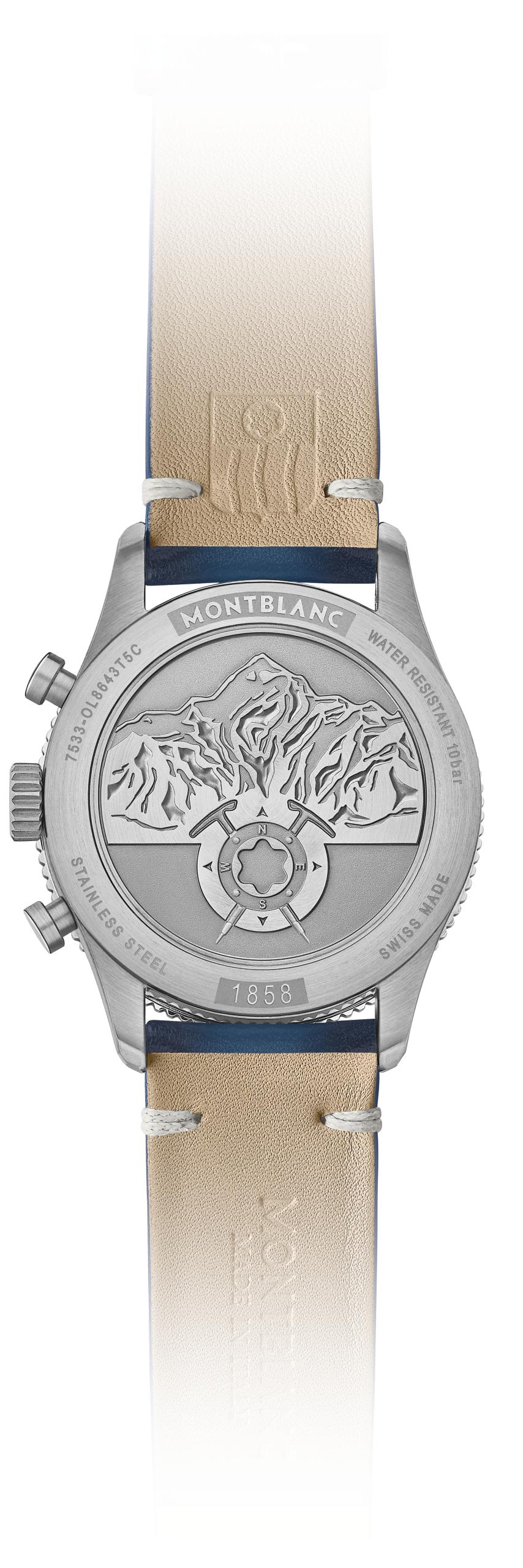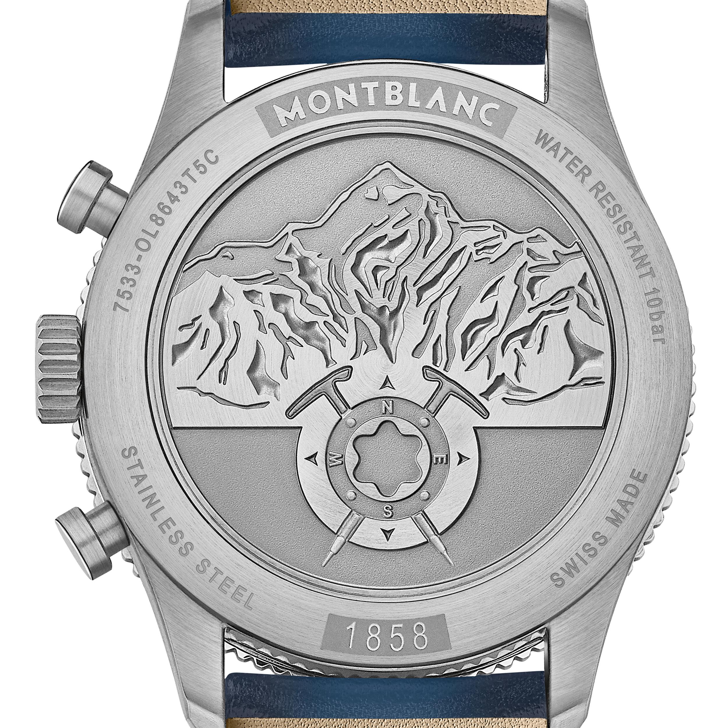 Die Montblanc 1858 Produktlinie ist von den legendären Minerva Profi-Uhren der 1920er- und 1930er-Jahre inspiriert, die zu militärischen Zwecken und für Entdeckungsreisen entwickelt wurden. Als Neuinterpretation dieser legendären Zeitmesser bringt die Montblanc 1858 Produktlinie das Abenteuer Bergsteigen zum Ausdruck – sie verkörpert den modernen Trend der Rückkehr zur Natur. In Anlehnung an die Eisberge zeichnet sich der Montblanc 1858 Automatic Chronograph durch seine blaue Gestaltung aus. Er verfügt zudem über eine beidseitig drehbare Lünette aus Edelstahl, die von glänzender blauer Keramik akzentuiert wird und mit einer Gravur der vier Himmelsrichtungen mit Leuchtbeschichtung versehen ist. Das 42-mm-Gehäuse aus Edelstahl verfügt über polierte und satinierte Veredelungen und ist auf dem Gehäuseboden mit einer Gravur des legendären Mont Blanc, eines Kompasses und zweier Eispickel versehen, die auf das Abenteuer Bergsteigen verweisen. Abgerundet wird das Design des Montblanc 1858 Automatic Chronograph von einem Sfumato-Kalbslederarmband in Blau.