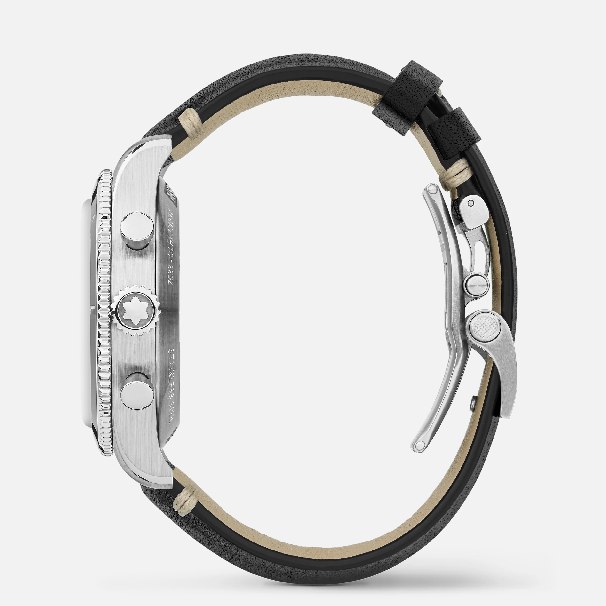 Die Montblanc 1858 Produktlinie ist von den legendären Minerva Profi-Uhren der 1920er- und 1930er-Jahre inspiriert, die zu militärischen Zwecken und für Entdeckungsreisen entwickelt wurden. Als Neuinterpretation dieser historischen Zeitmesser bringt die Montblanc 1858 Produktlinie das Abenteuer Bergsteigen zum Ausdruck – sie verkörpert den modernen Trend der Rückkehr zur Natur. Die Montblanc 1858 Automatic Chronograph zeichnet sich durch ihre beidseitig drehbare Lünette aus Edelstahl aus, die von glänzender Keramik in Schwarz akzentuiert wird und mit einer Gravur der vier Himmelsrichtungen mit Leuchtbeschichtung versehen ist. Das 42-mm-Gehäuse aus Edelstahl verfügt über polierte und satinierte Veredelungen ist auf dem Gehäuseboden mit einer Gravur des Mont Blanc, eines Kompasses und zweier Eispickel verziert, die auf das Abenteuer Bergsteigen verweisen. Für eine optimierte Ablesbarkeit und ein hochwertiges Design sorgt das schwarze Zifferblatt, das mit historischen Kathedralenzeigern mit Leuchtbeschichtung in Beige und mit arabischen Leuchtziffern in Beige versehen ist. Abgerundet wird die Uhr von einem Kalbslederarmband in Schwarz mit Nähten in Beige.