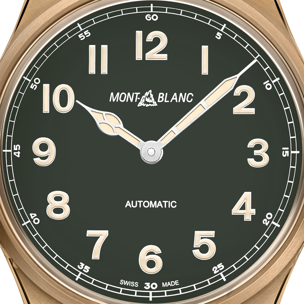 Die Montblanc 1858 Produktlinie ist von den legendären Profi-Uhren von Minerva aus den 1920er- und 1930er-Jahren inspiriert, die zu Militärzwecken und für Forschungsreisen entwickelt wurden. Als Interpretation dieser legendären Uhren bringt die Montblanc 1858 Produktlinie das Abenteuer Bergsteigen zum Ausdruck, den modernen Trend der Rückkehr zur Natur. Die 1858 Automatic Limited Edition verfügt über ein poliertes und satiniertes 40-mm-Gehäuse in Bronze mit schlanken abgeschrägten Hörnern. Den Gehäuseboden zieren ein gravierter Mont Blanc, ein Kompass und zwei gekreuzte Eispickel als Verweis auf das Abenteuer Bergsteigen. Für eine optimierte Ablesbarkeit bildet das khakigrüne Zifferblatt einen Kontrast zu den historischen Leuchtzeigern in Kathedralenform mit „Cloisonné“-Design, das leicht gewölbt ist, um ein besonders feines Finish zu erzielen. Zu den weiteren Details zählen beigefarbene arabische Ziffern mit SuperLumiNova*-Beschichtung, eine Minuteneinteilung in Schienenoptik und das Montblanc Logo aus den 1930er-Jahren mit der historischen Schrift und dem Emblem des Mont Blanc. Die Uhr verfügt über ein hochwertiges gewebtes „NATO“-Armband in Khakigrün, das auf die Zifferblattfarbe abgestimmt ist und für einen modernen Look sorgt.