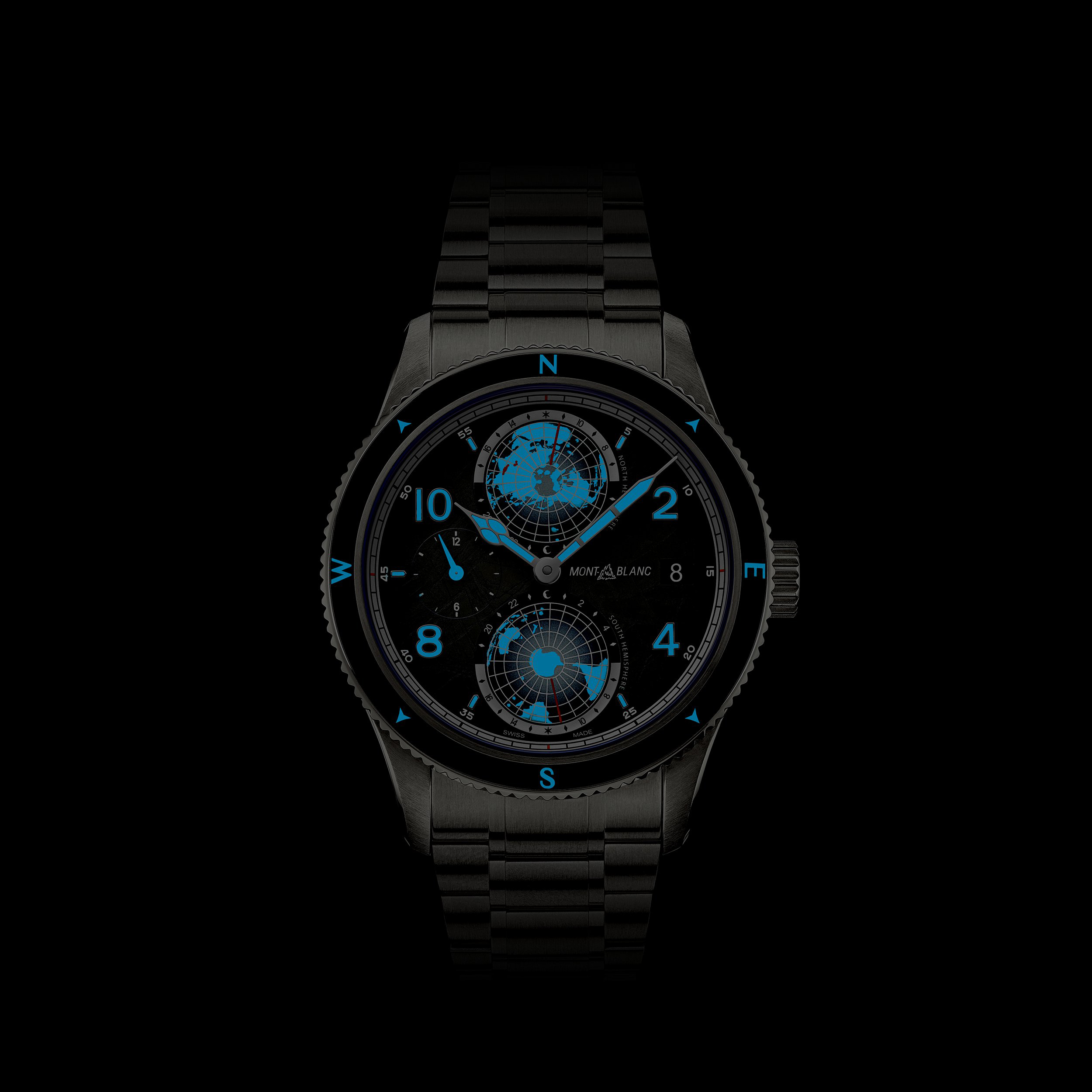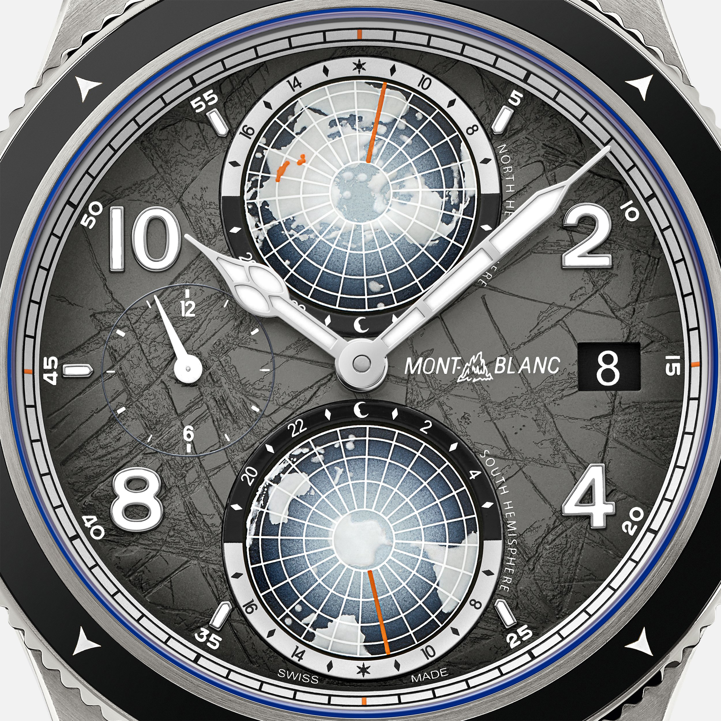 Als Hommage an die höchsten Gipfel der Welt und die Bergsteiger, die diese unter extremen Bedingungen mutig erklimmen, verfügt die Montblanc 1858 Geosphere 0 Oxygen The 8000 über ein 42-mm-Titangehäuse, das frei ist von Sauerstoff. Das Vermeiden von Feuchtigkeitsbildung und Oxidation ist für die Entdecker von großem Vorteil, da das Uhrwerk so länger und präziser funktioniert. Angetrieben wird die Uhr vom MB 29.25 Automatikwerk mit Manufaktur-Weltzeitkomplikation, das die Uhrzeit in den 24 Stunden auf den Kontinenten mit Leuchtbeschichtung auf den sich drehenden dreidimensionalen nördlichen und südlichen Halbkugeln anzeigt und zudem eine Tag-/Nachtanzeige, eine zweite Zeitzone und eine Datumsanzeige bietet. Zudem besitzt der Zeitmesser eine geriffelte, beidseitig drehbare schwarze Keramiklünette mit leuchtenden Himmelsrichtungen, ein dunkelgraues Sfumato-Zifferblatt mit Gletschermotiv und orangefarbenen Akzenten und ein austauschbares, schmal zulaufendes Titanarmband mit Feineinstellung. Den Gehäuseboden dieses Modells ziert eine 3D-Lasergravur des K2, der durch seine unglaubliche Farbe, Tiefe und seine realistische Darstellung begeistert.