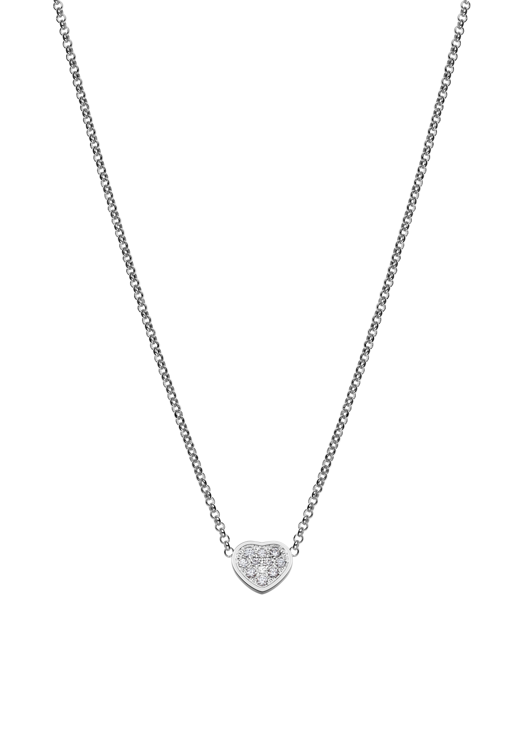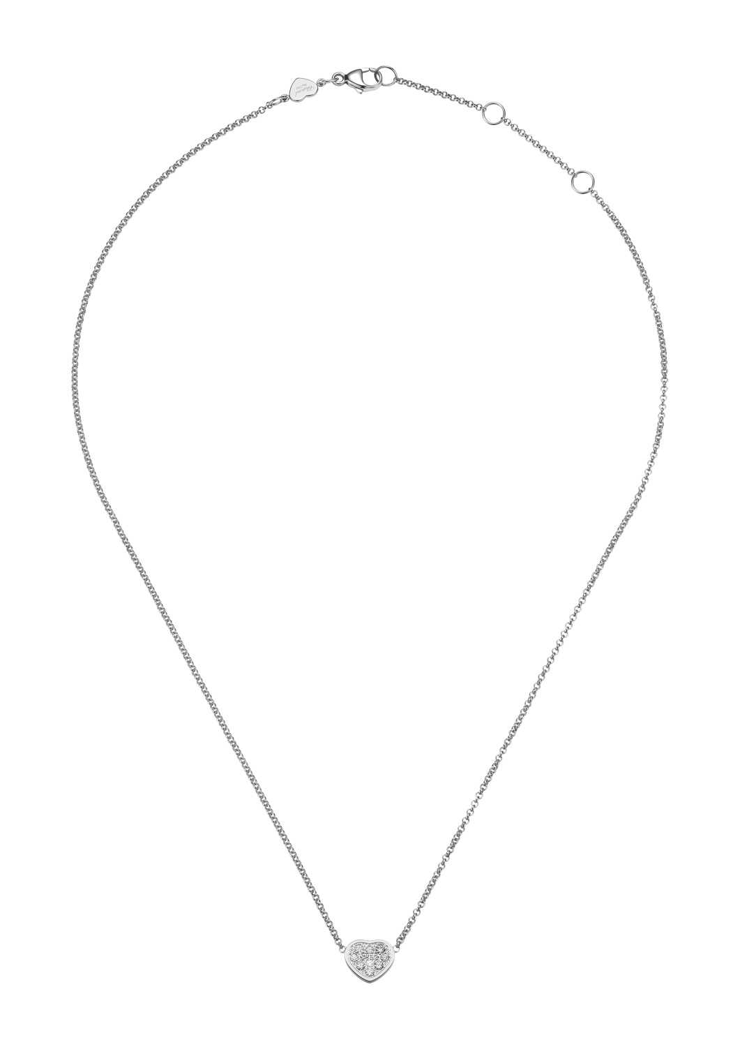 Die Schmuckkollektion My Happy Hearts übernimmt die bekanntesten Designcodes der legendären Chopard-Kreationen: das Herz und die beweglichen Diamanten. Die My Happy Hearts Colliers aus ethischem Roségold mit den Herzmotiven sind zierliche Schmuckstücke, die als stylishe Accessoires einzeln oder miteinander kombiniert getragen werden können. Me, Myself and My Happy Hearts Halskette 81A086-1901: Collier aus 18 Karat Weissgold mit 0,12 Karat weisser Diamant.