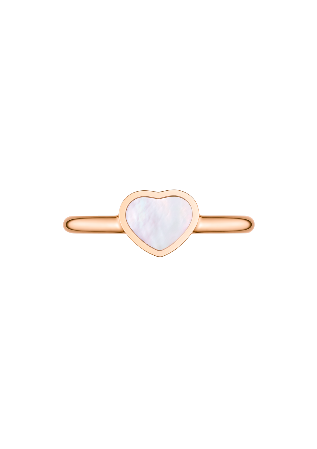 Die Schmuckkollektion My Happy Hearts übernimmt die bekanntesten Designcodes der legendären Chopard-Kreationen: das Herz und die beweglichen Diamanten. Die My Happy Hearts Diamantringe mit den Herzmotiven sind zierliche Schmuckstücke, die als stylishe Accessoires einzeln oder miteinander kombiniert getragen werden können. Me, Myself and My Happy Hearts Ring 82A086-5300 aus ethischem Roségold mit Perlmutt.