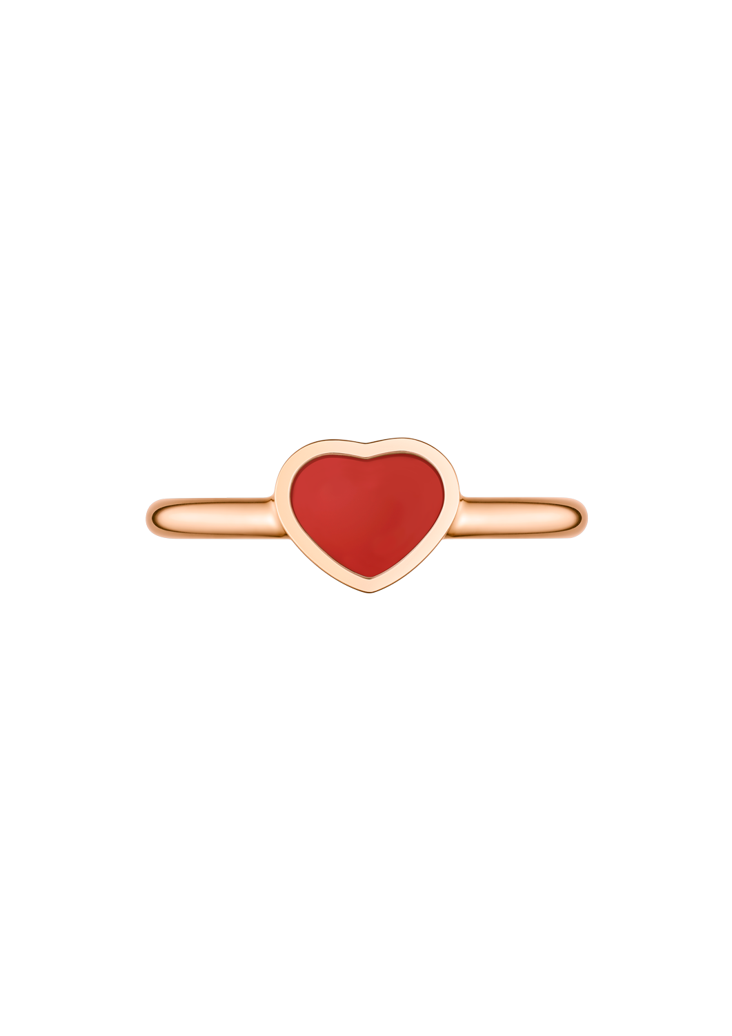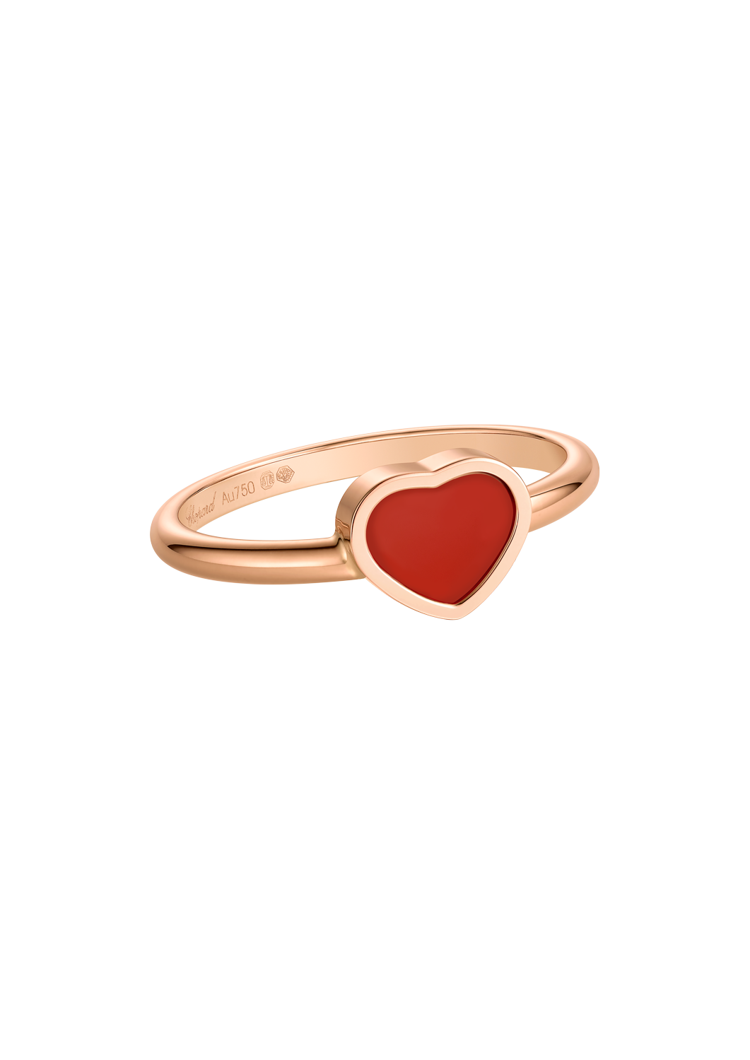 Die Schmuckkollektion My Happy Hearts übernimmt die bekanntesten Designcodes der legendären Chopard-Kreationen: das Herz und die beweglichen Diamanten. Die My Happy Hearts Diamantringe mit den Herzmotiven sind zierliche Schmuckstücke, die als stylishe Accessoires einzeln oder miteinander kombiniert getragen werden können. Me, Myself and My Happy Hearts Ring 82A086-5800 aus ethischem Roségold mit Karneol.