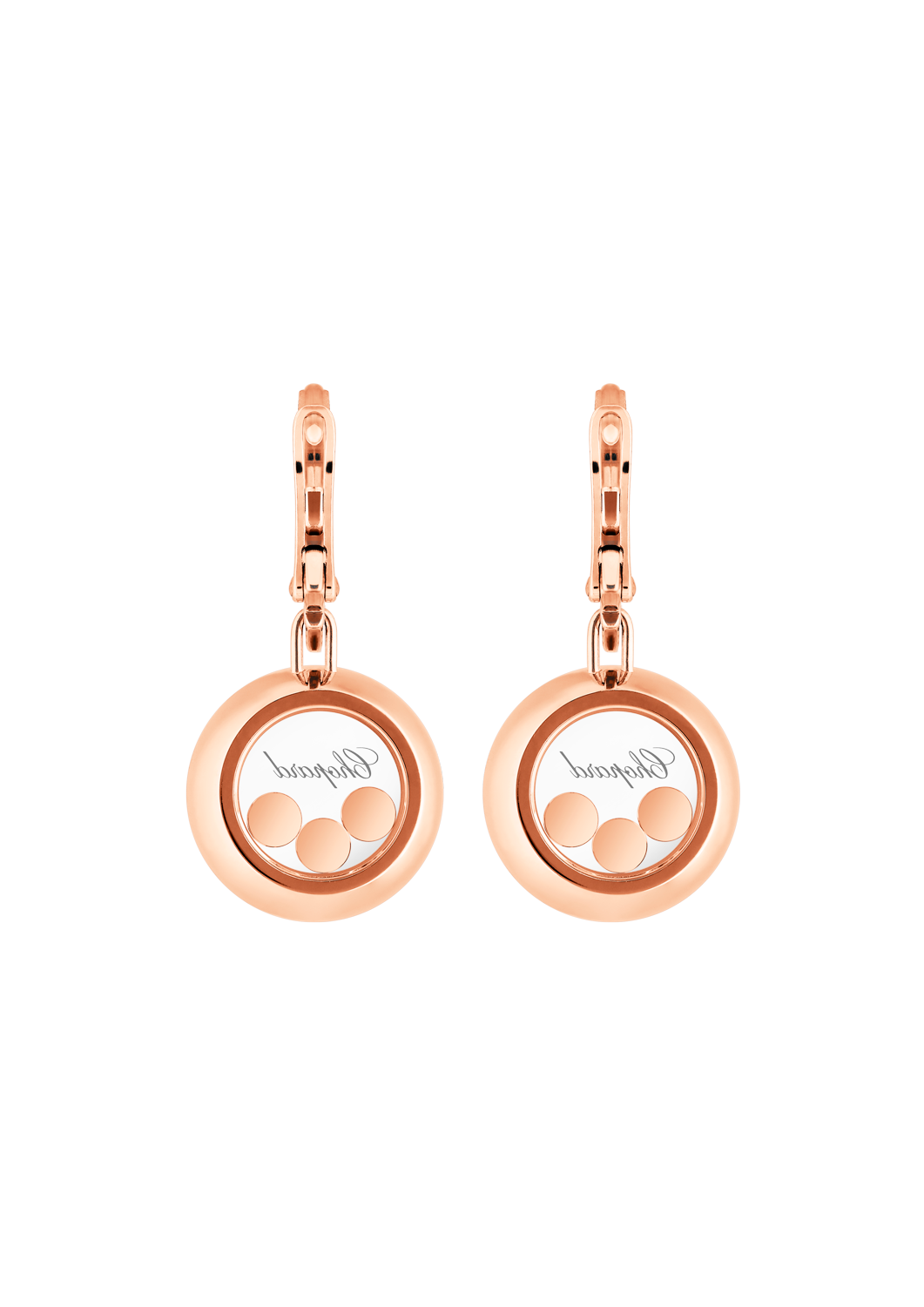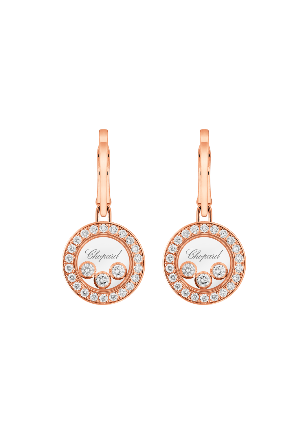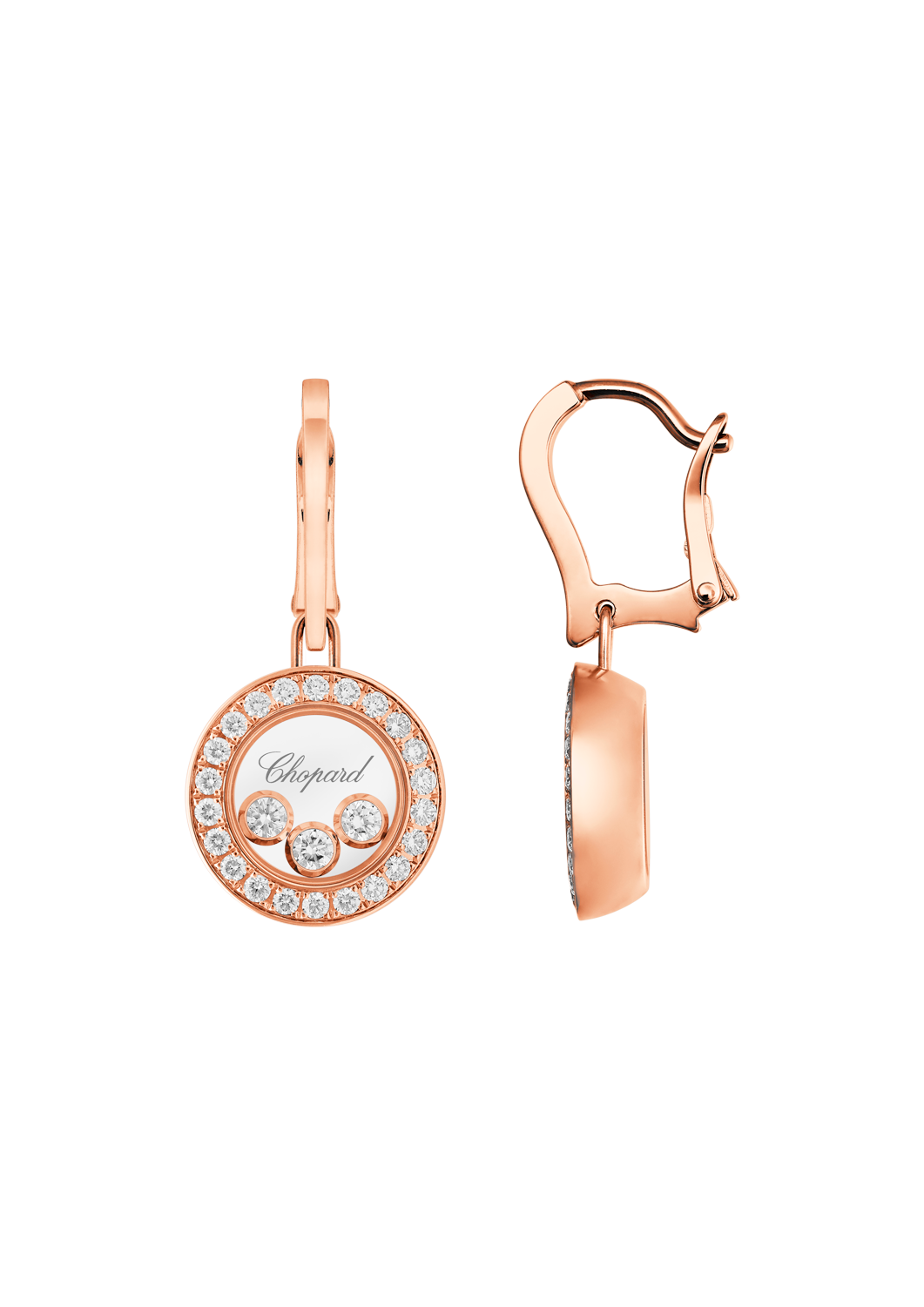 Als Herzstück der Damenschmuckserie ist die Kollektion Happy Diamonds Icons ebenso einzigartig wie verspielt. Inspiriert von den glitzernden Tropfen eines Wasserfalls wirbeln die drei frei beweglichen Diamanten dieser neuen runden Ohrhänger aus 18 Karat Roségold (Referenznummer 83A018-5401) zwischen zwei Saphirgläsern umher und lassen eine zarte und fröhliche Kaskade des Lichts entstehen.