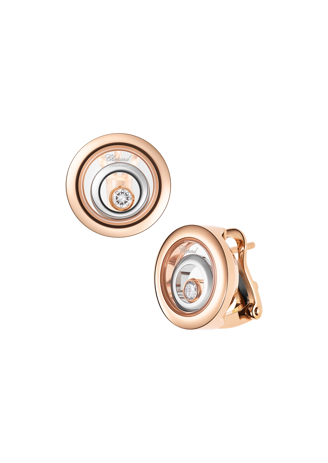 Zu Beginn des neuen Jahrhunderts entstand mit den ikonischen tanzenden Diamanten von Chopard die Happy Spirit-Kollektion mit hypnotisierendem Charme. Die Schmuckstücke sind Glücksbringer für die Trägerinnen und zeichnen ein lebendiges Bild mit den Diamanten in Bewegung. Little Diamonds Do Great Things. Happy Spirit Ohrstecker 848230-9001 aus 18 Karat Weissgold und Roségold mit beweglichen Diamanten 0.19 ct.