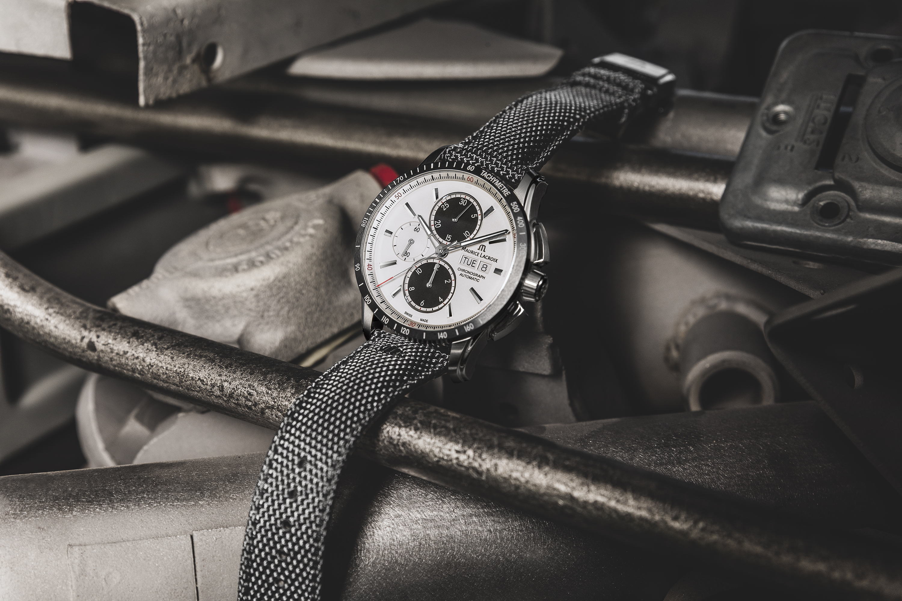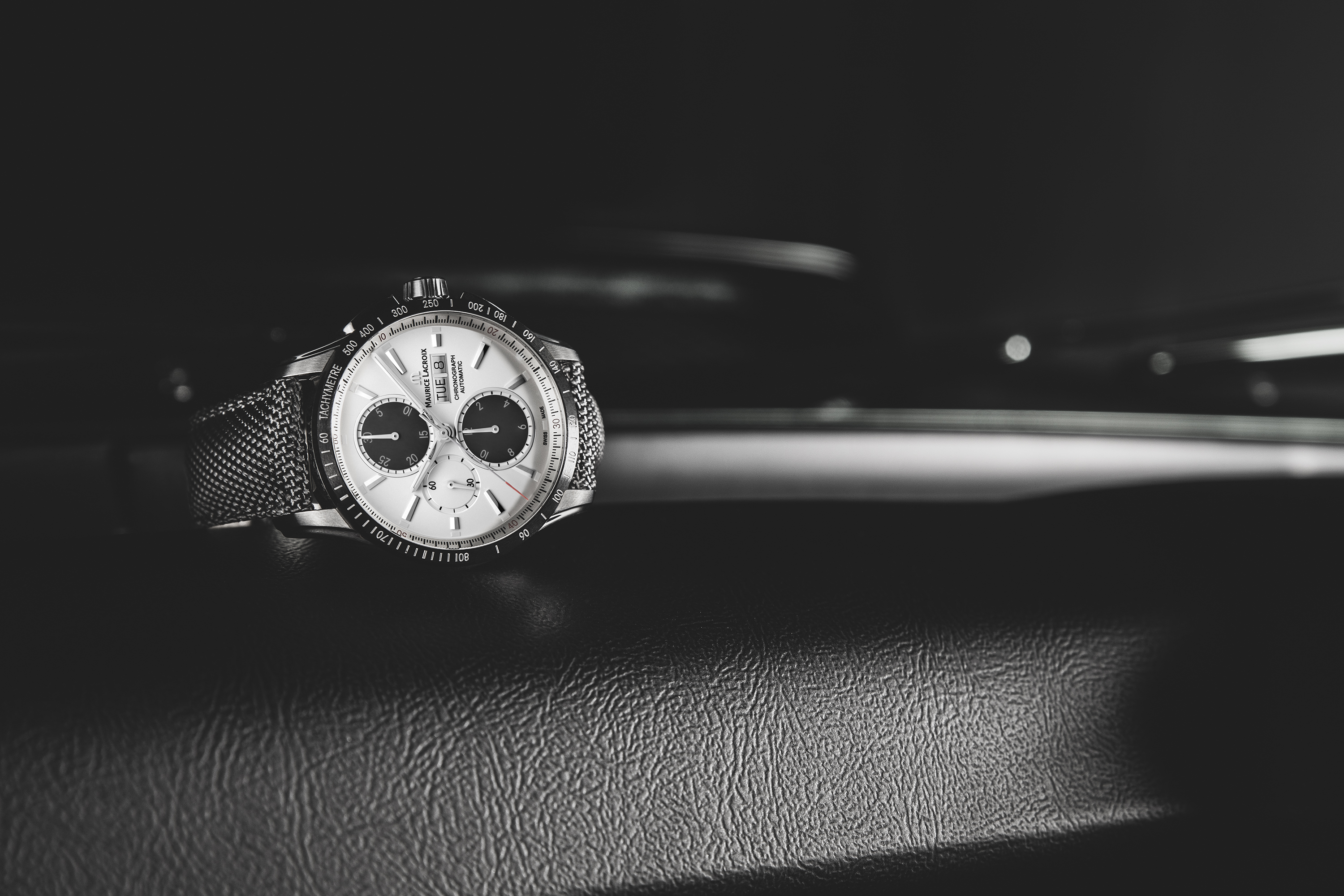 angeordnet sind. Bei näherer Betrachtung zeigt sich jedoch, dass die Uhr zusätzlich über eine ansprechende Anzeige der kleinen Sekunde bei 9 Uhr sowie des Wochentags und Datums bei 3 Uhr verfügt. Etwas dominanter treten der 30-Minuten-Zähler bei 12 Uhr und der 12-Stunden-Zähler darunter in Erscheinung, die jeweils mit sandgestrahlten Zentren und azurierten Reifen versehen sind. Das Designteam von Maurice Lacroix hat die Komposition um zahlreiche Facetten bereichert, indem es die Zifferblattkomponenten auf verschiedenen Ebenen präsentiert und Farben geschickt einsetzt. Die Lünette aus kratzfester Keramik ist mit einem Tachymeter ausgestattet, einer Funktion, die es dem Träger ermöglicht, die Geschwindigkeit eines Objekts über eine bekannte Distanz zu bestimmen. Dies unterstreicht den sportlichen Charakter der Uhr und verleiht ihr gleichzeitig eine klassische Retro-Optik. Maurice Lacroix hat einige Designelemente der Vorgängermodelle beibehalten, wie die länglichen Drücker und die markanten doppelt gestuften Bandanstöße. Das Gehäuse bietet einen Kontrast zwischen satinierten und polierten Oberflächen, die den bemerkenswerten Sinn für Stil des Hauses unter Beweis stellen. Der Saphirglasboden der Uhr gewährt zudem einen Blick auf das Automatikkaliber ML112. Dieses ziert eine Kombination aus Genfer Streifen, Perlage und Sonnenschliff und wird damit dem Ruf