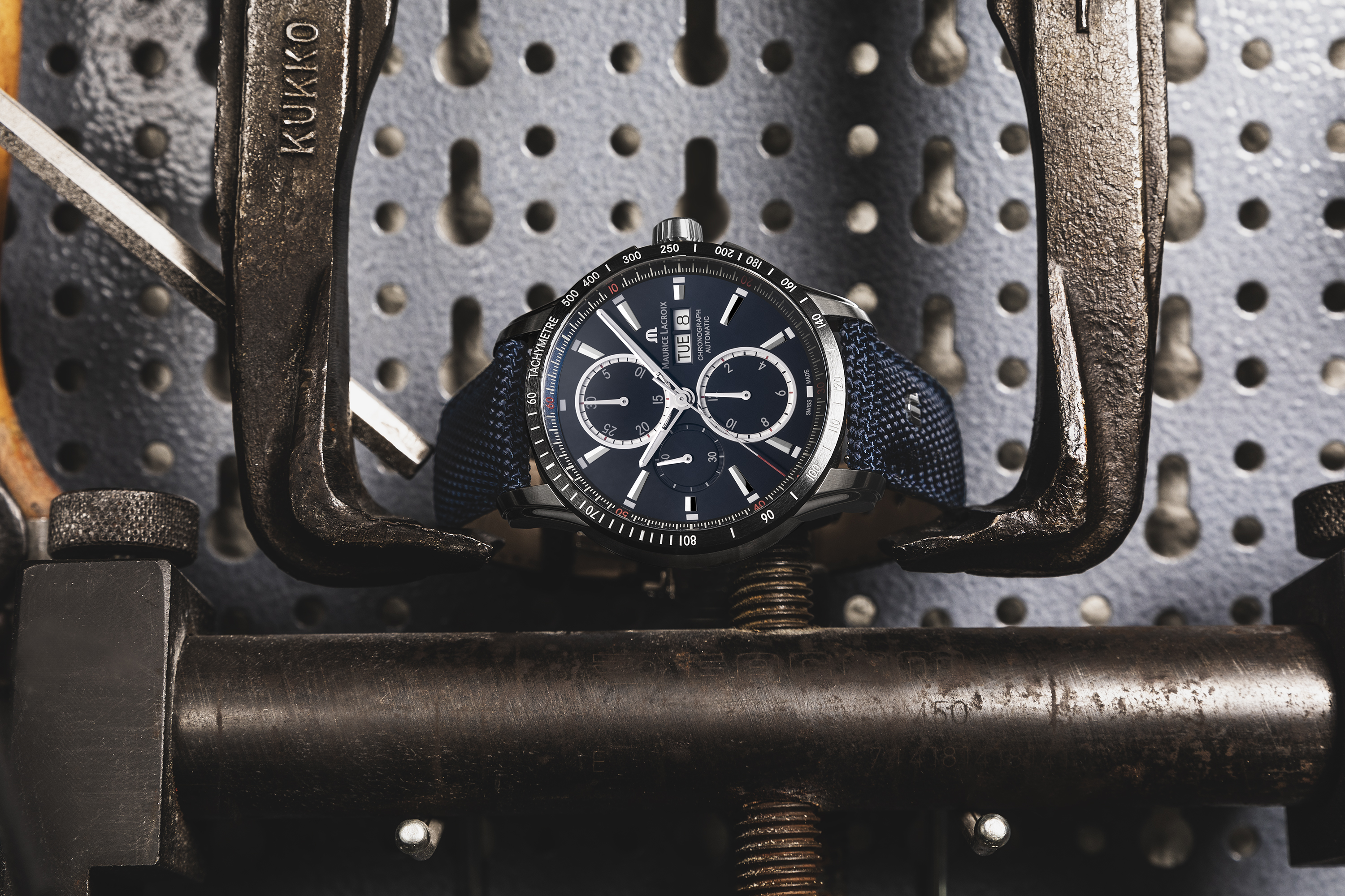 angeordnet sind. Bei näherer Betrachtung zeigt sich jedoch, dass die Uhr zusätzlich über eine ansprechende Anzeige der kleinen Sekunde bei 9 Uhr sowie des Wochentags und Datums bei 3 Uhr verfügt. Etwas dominanter treten der 30-Minuten-Zähler bei 12 Uhr und der 12-Stunden-Zähler darunter in Erscheinung, die jeweils mit sandgestrahlten Zentren und azurierten Reifen versehen sind. Das Designteam von Maurice Lacroix hat die Komposition um zahlreiche Facetten bereichert, indem es die Zifferblattkomponenten auf verschiedenen Ebenen präsentiert und Farben geschickt einsetzt. Die Lünette aus kratzfester Keramik ist mit einem Tachymeter ausgestattet, einer Funktion, die es dem Träger ermöglicht, die Geschwindigkeit eines Objekts über eine bekannte Distanz zu bestimmen. Dies unterstreicht den sportlichen Charakter der Uhr und verleiht ihr gleichzeitig eine klassische Retro-Optik. Maurice Lacroix hat einige Designelemente der Vorgängermodelle beibehalten, wie die länglichen Drücker und die markanten doppelt gestuften Bandanstöße. Das Gehäuse bietet einen Kontrast zwischen satinierten und polierten Oberflächen, die den bemerkenswerten Sinn für Stil des Hauses unter Beweis stellen. Der Saphirglasboden der Uhr gewährt zudem einen Blick auf das Automatikkaliber ML112. Dieses ziert eine Kombination aus Genfer Streifen, Perlage und Sonnenschliff und wird damit dem Ruf