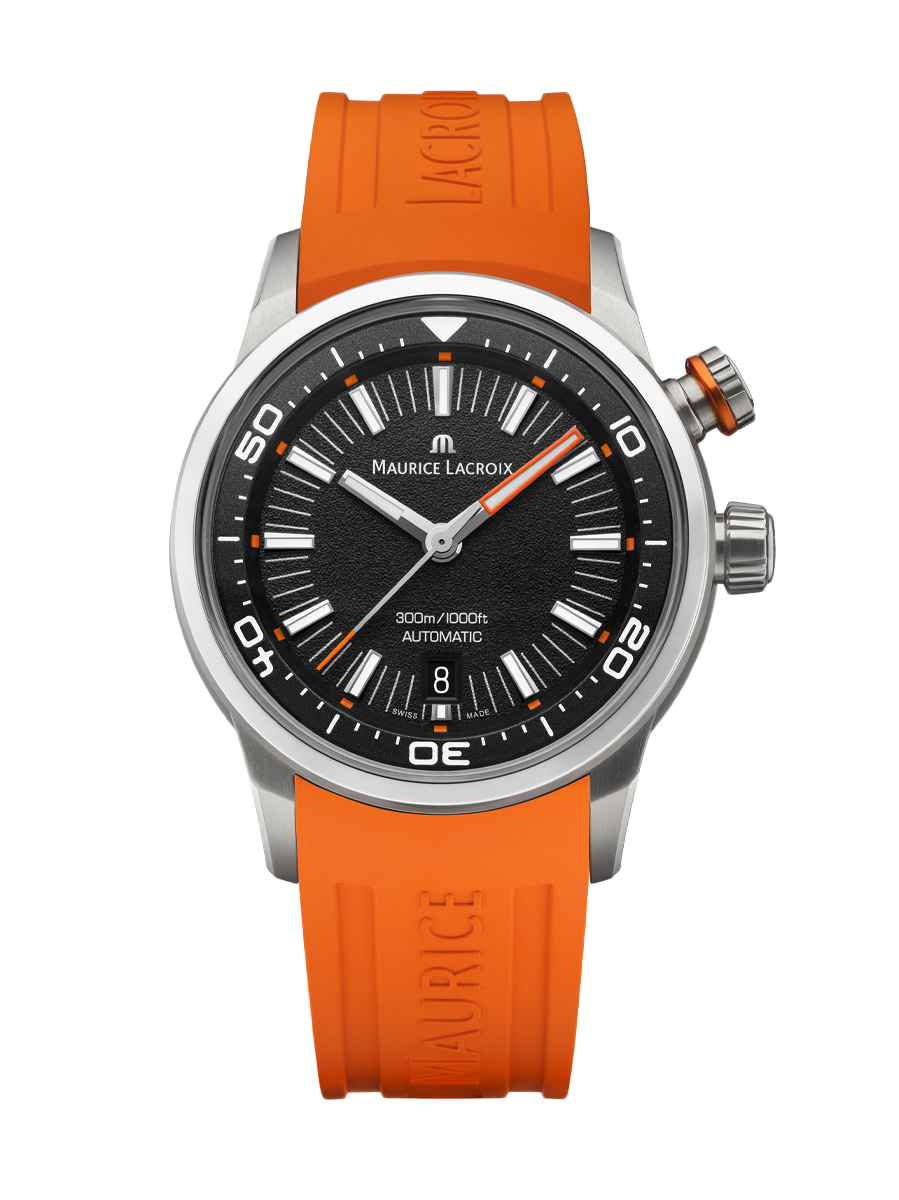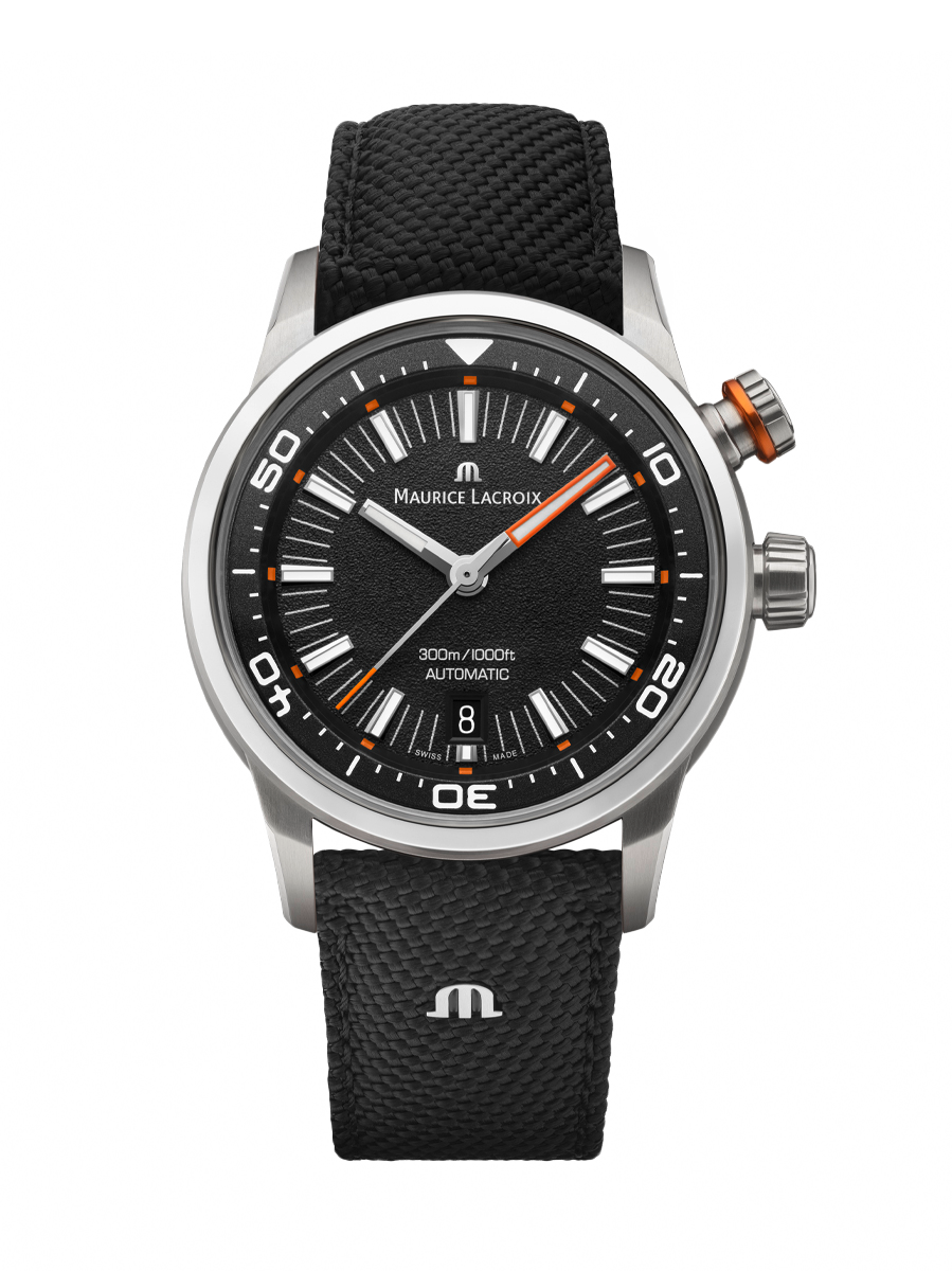 Armband: | Orangefarbenes Kautschukarmband mit Maurice Lacroix Prägung und EasyChange-System., Schwarzes Kautschukarmband mit Maurice Lacroix Prägung und EasyChange-System, Schwarzes Nylonarmband mit schwarzen Nähten, rhodiniertem M-Logo und EasyChange-System. |