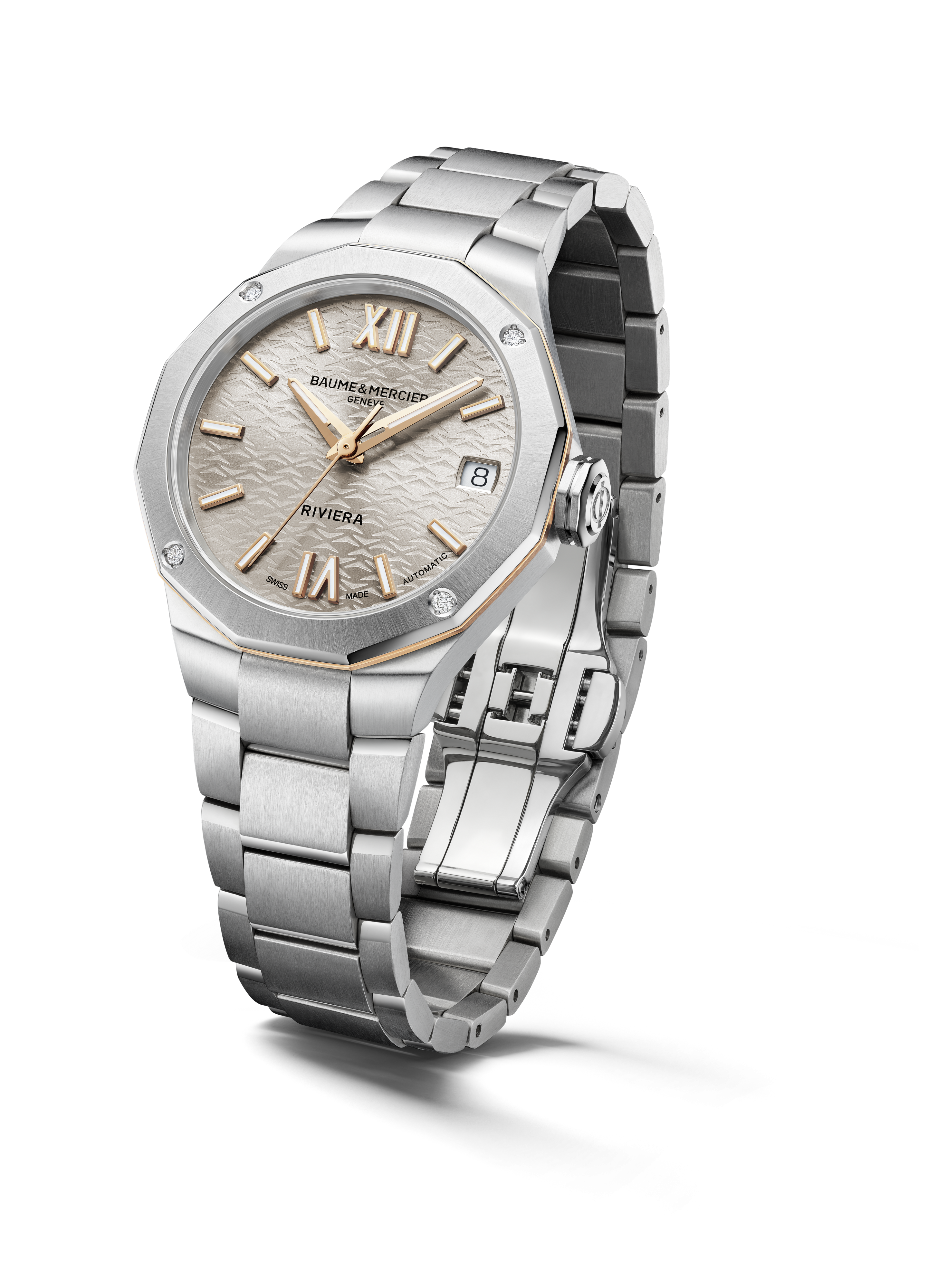 2023 präsentiert Baume und Mercier die wichtigste Neuheit der Kollektion: das Modell Riviera M0A10730. Die Wärme des goldenen Zifferblatts mit Sonnenschliff und Wellendekor mit transparenten Akzenten und der von ihm ausgehende solare Glanz bilden eine wunderschöne Kulisse für die römischen Ziffern, die genieteten Indizes mit Superluminova (C1, blau leuchtend) und die facettierten goldenen Zeiger, die die Stunden, Minuten und Sekunden ausweisen. Bei 3 Uhr offenbart ein unauffälliges Fenster das Datum. Die Präsenz dieser Uhr wird durch vier Diamanten im Brillantschliff (Top Wesselton, VS-Qualität, 0,05 ct) hervorgehoben, die die Lünette aus poliertem Edelstahl mit Sonnenschliff des zwölfeckigen Gehäuses schmücken.