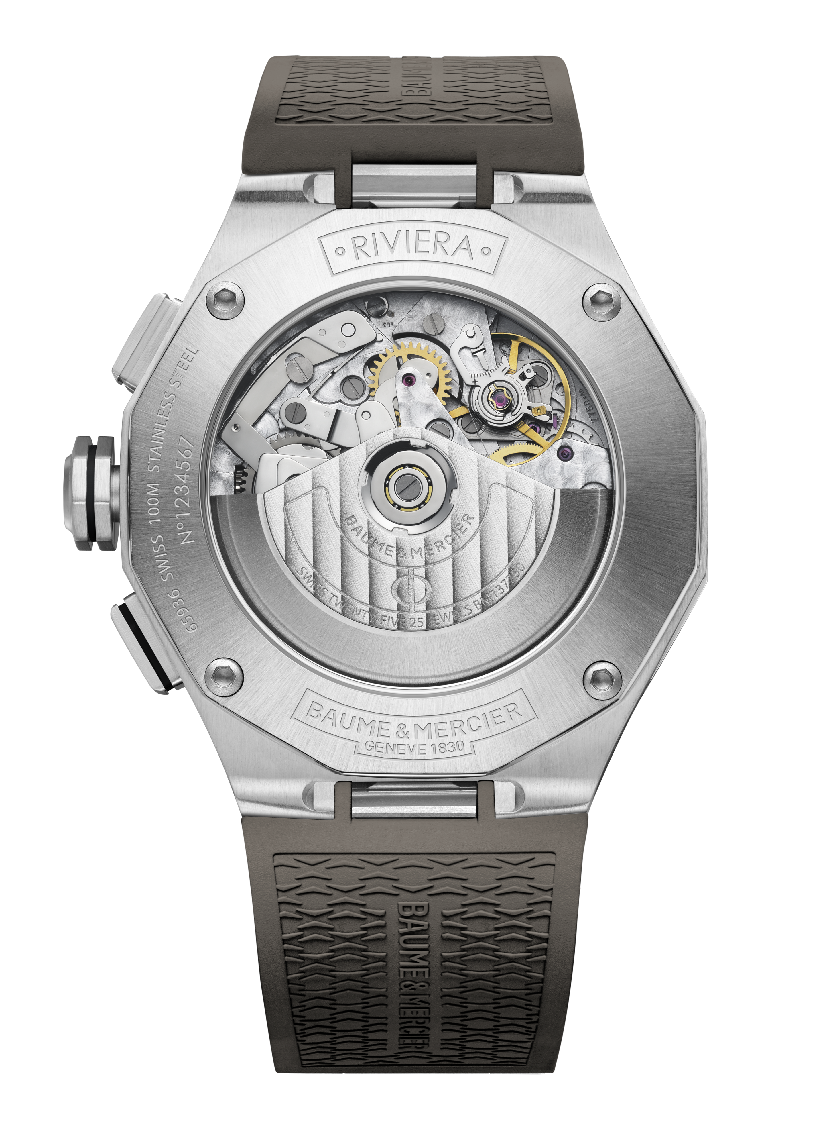 Mit seinem 43 mm großen Stahlgehäuse und der zwölfeckigen Lünette aus kugelgestrahltem Titan, die mit vier Schrauben aus kugelgestrahltem Stahl befestigt ist, kündigt dieses charakterstarke Stück schon auf den ersten Blick die Farbe an: die der Leidenschaft für Action. Ein Chronograph mit kraftvollem Design, der die Tradition respektiert und die Zukunft neu schreibt. Das ursprüngliche Design ist da, der Wunsch, sich an die Zeit anzupassen, auch. Dieser bis 100 Meter wasserdichte Chronograph, das jüngste Mitglied der Riviera-Kollektion, wird von einem hochwertigen Swiss-Made-Mechanikwerk mit Automatikaufzug angetrieben und zeigt Tag und Datum in zwei horizontalen Fenstern bei 3 Uhr an. Diese Uhr ist ein Emblem des Sport-Chic und bietet die Erinnerungskraft der Originalmodelle aus den 70er Jahren, indem sie deren DNA neu interpretiert. Sie hat die Form, den Geist und die Funktion dieser Uhren.
