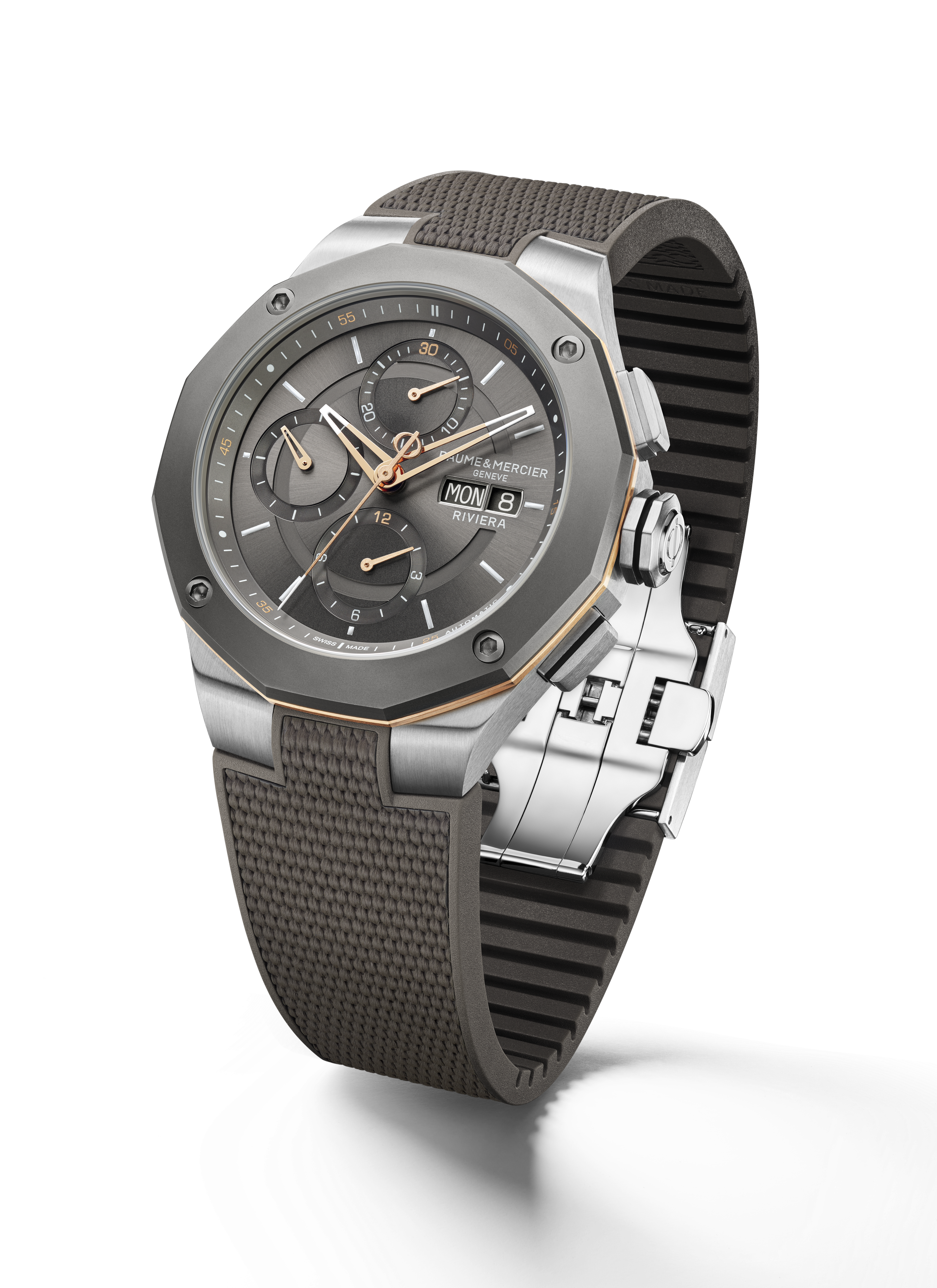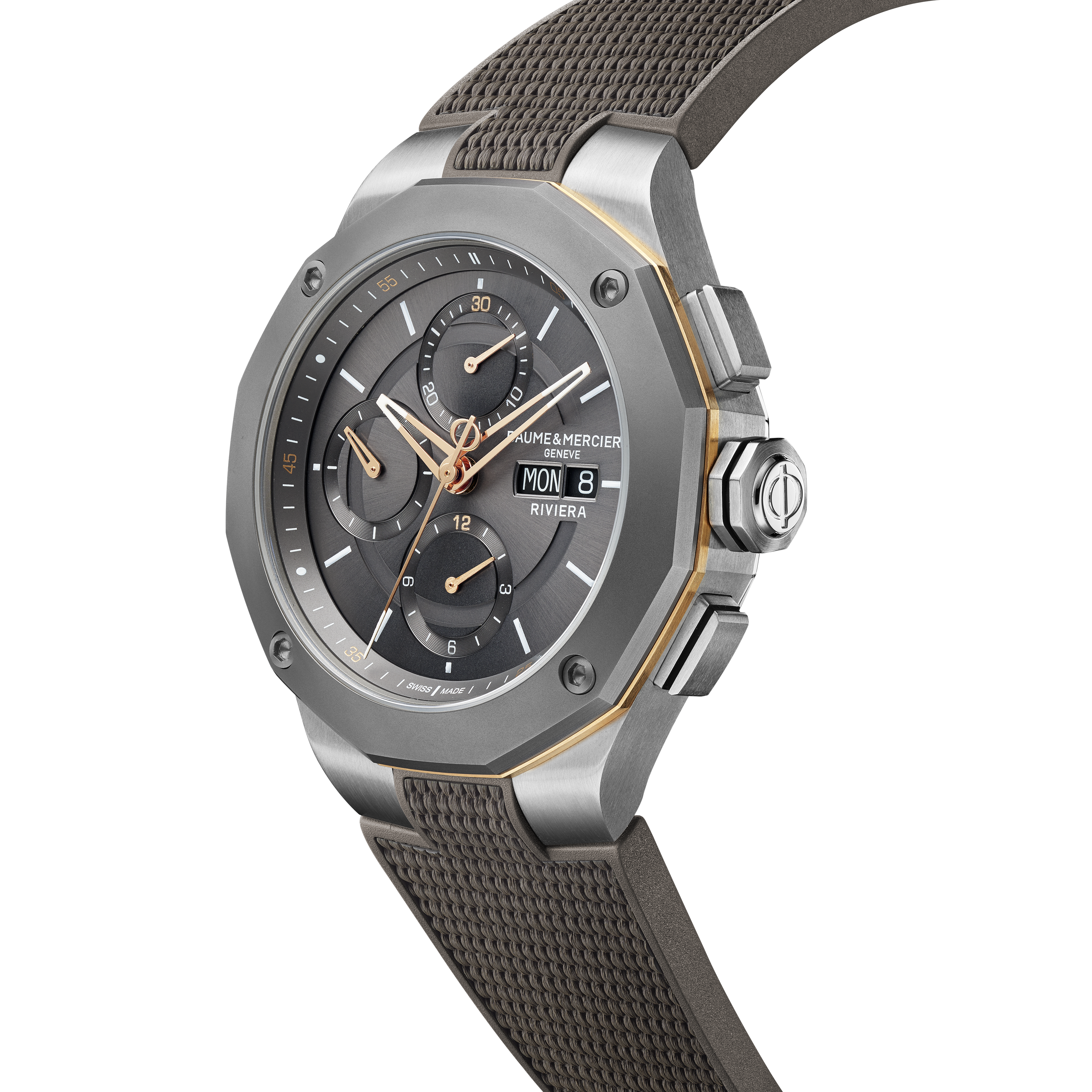 Die mit einem Valjoux-Automatikwerk ausgestattete Riviera 10722 verfügt über ein schiefergraues, satiniertes Zifferblatt und ein graues Kautschukarmband mit Segeltuchdekor. Mit einer sandgestrahlten Titanlünette, die von einem PVD-Goldring umrahmt wird, steht dieser Zeitmesser ganz in der Tradition der Chronographen der Maison.
