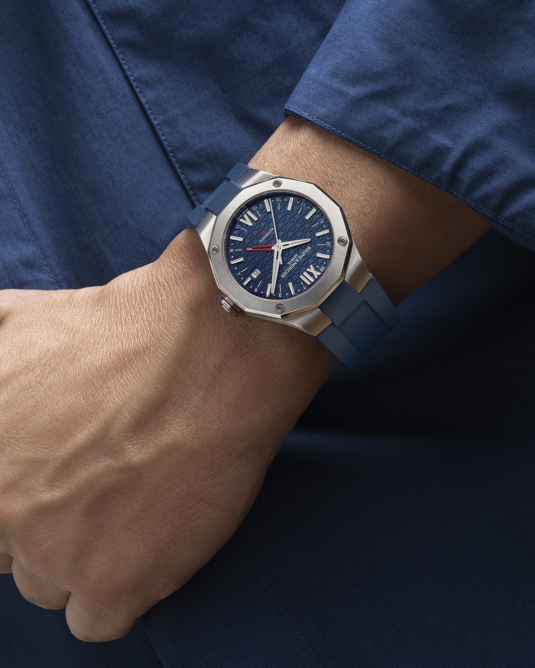 Die Baume et Mercier Riviera 10659 mit GMT-Komplikation besticht durch ein zwölfeckiges Edelstahlgehäuse und ein blaues Zifferblatt mit satiniertem Sonnenschliff und Wellendekor. An der Grenze zwischen Klassik und Ungezwungenheit zieren diese Riviera ferner ein Saphirglasboden und ein austauschbares Fast-Strap-Armband aus blauem Kautschuk. Als Reiseuhr ermöglicht die Riviera 10659 ihren Trägern – mithilfe eines vierten Zeigers – das sofortige Ablesen der Uhrzeit in einer zweiten Zeitzone. Dieser zentrale rote Zeiger, der in 24 Stunden das Zifferblatt umläuft, weist über eine subtile Zeitskala mit Stundenmarkierung die exakte Zeit am Reiseort aus. Die mit einer Wasserdichtigkeit von 100 Metern technisch unfehlbaren Zeitmesser werden den Erwartungen anspruchsvollster Globetrotter gerecht und verkörpern Baume et Merciers Vision der modernen Uhrmacherei.