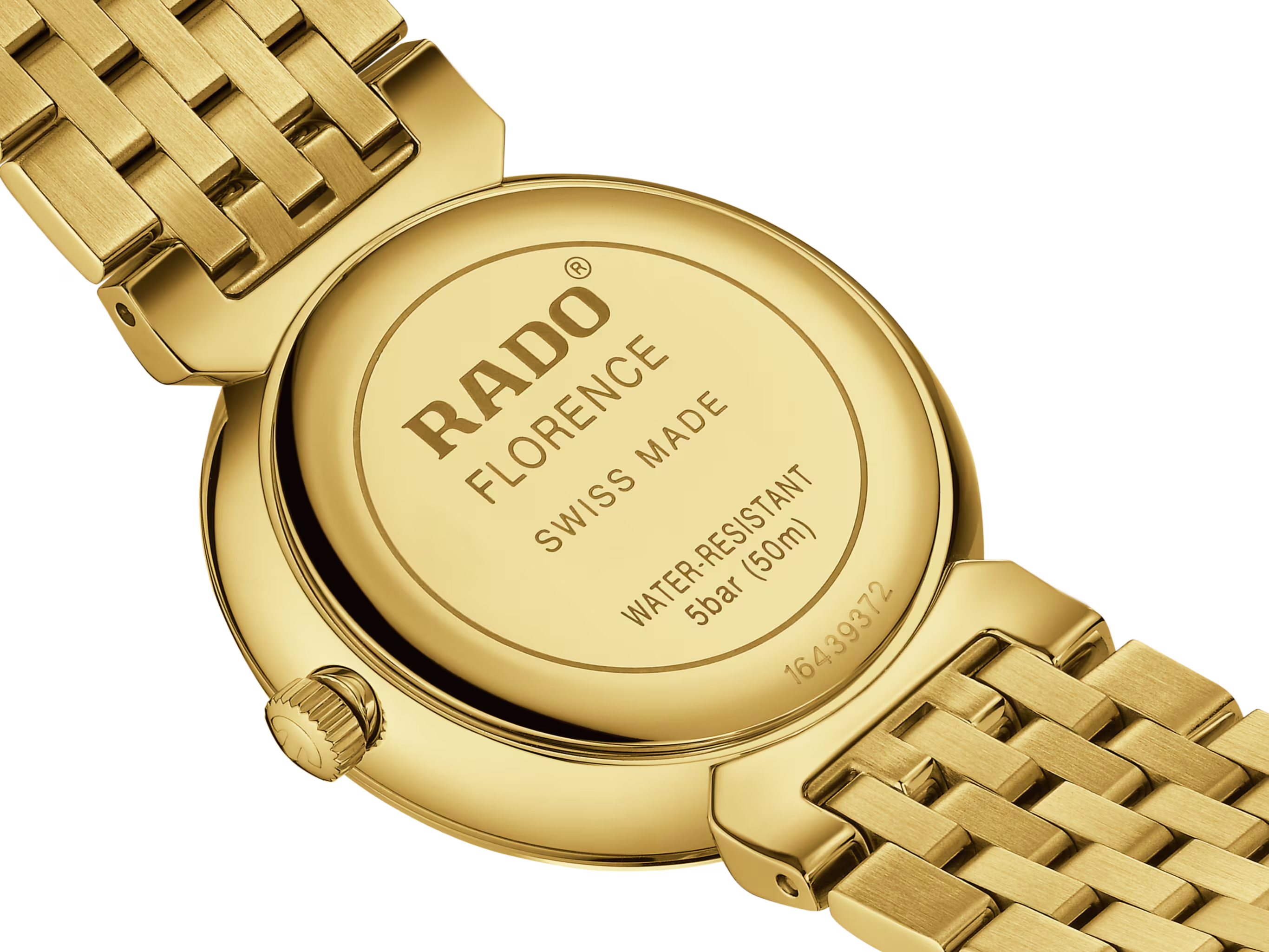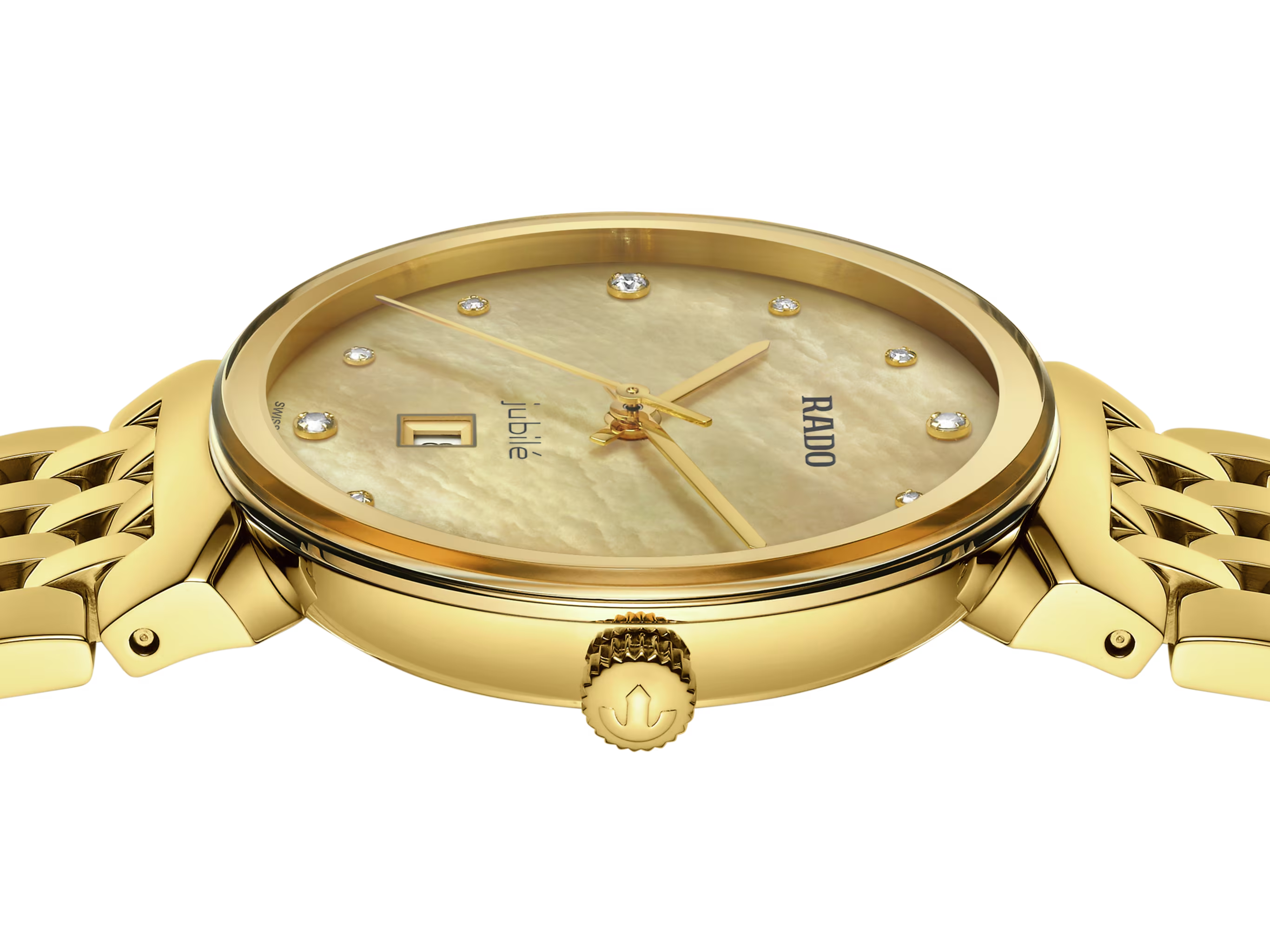 Das harmonische Design der Rado Florence Diamonds R48915903 ruft einem die eleganten Kuppeln und Türme der Stadt in Erinnerung, der die Kollektion ihren Namen zu verdanken hat. Die durch ein zuverlässiges Rado Quarzwerk vom Kaliber R079 mit drei Zeigern betriebene Uhr gewährleistet eine grössere Genauigkeit und Stossfestigkeit. Die 30 mm grosse Uhr verfügt über ein gewölbtes Saphirglas mit facettierten Rändern. Zudem sind Gehäuse, Krone, Lünette und Gehäuseboden aus einem beeindruckenden Material gefertigt: poliertem gelbgoldfarbenen Edelstahl mit PVD-Beschichtung. Abgerundet wird die Gesamtoptik dieses klassischen Zeitmessers durch ein Armband aus poliertem gelbgoldfarben beschichteten Edelstahl. Das Zifferblatt aus Perlmutt mit 12 Diamanten wird durch das per Druck aufgetragene Jubile-Logo noch besser zur Geltung gebracht und ist perfekt auf die gelbgoldfarbenen Zeiger abgestimmt. Die Uhr ist bis zu einer Tiefe von 50 m wasserdicht und auch in Grösse L erhältlich – damit ist sie die perfekte Paar-Uhr.
