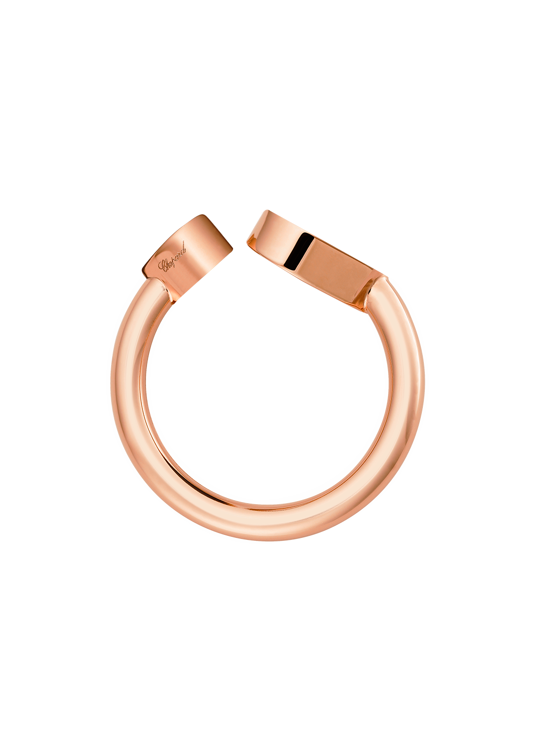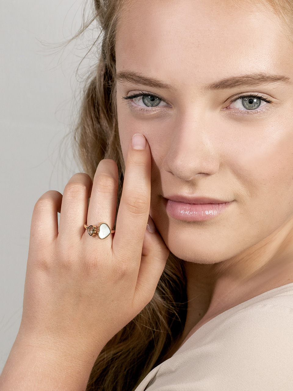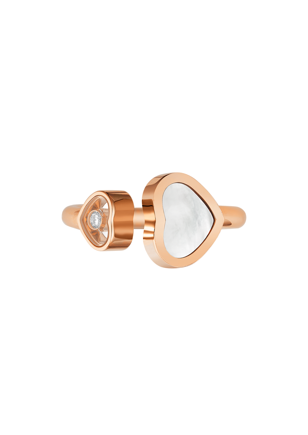 Der Happy Hearts Ring aus 18-Karat Roségold ist eine edle Ergänzung zur „Happy Diamonds“-Kollektion. Zwei kontrastierende Herzen sind in einer Liaison schillernder Harmonie auf dem Finger filigran nebeneinander gelegt. Das grössere Herz ist mit natürlichem Perlmutt gefüllt, während das kleinere einen der beweglichen Diamanten von Chopard umhüllt, der zur Melodie moderner Weiblichkeit tanzt: stark, strahlend, mühelos und voller Lebensfreude.